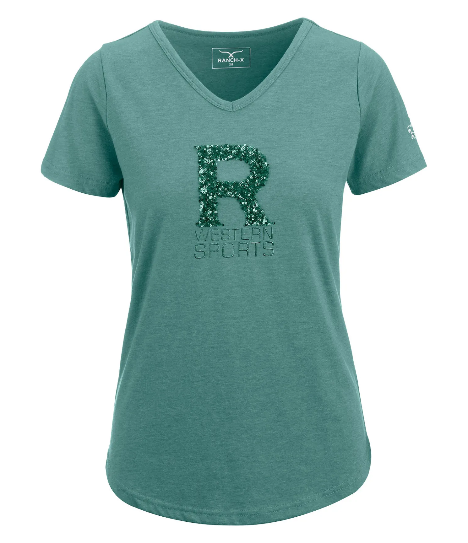 T-shirt col-V. Coupe ample et matière respirante. Motif à paillettes. 65 % polyester, 35 % coton.