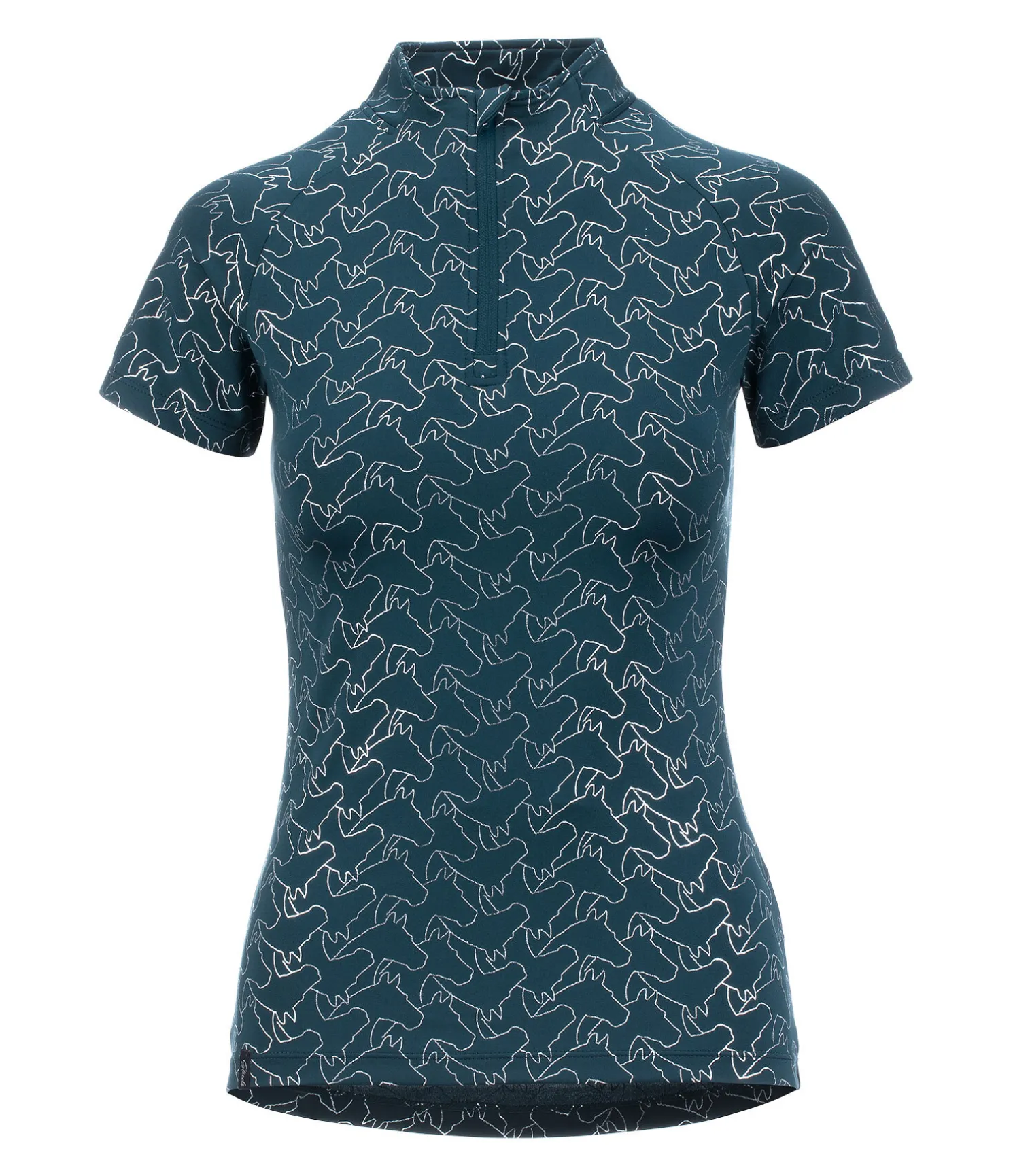 T-shirt chic et technique à manches courtes. Imprimé all-over métallisé motif tête de cheval. Manches raglan et petit col montant avec fermeture à glissière et protège-menton. Respirant et à séchage rapide. 88 % polyester, 12 % élasthanne.