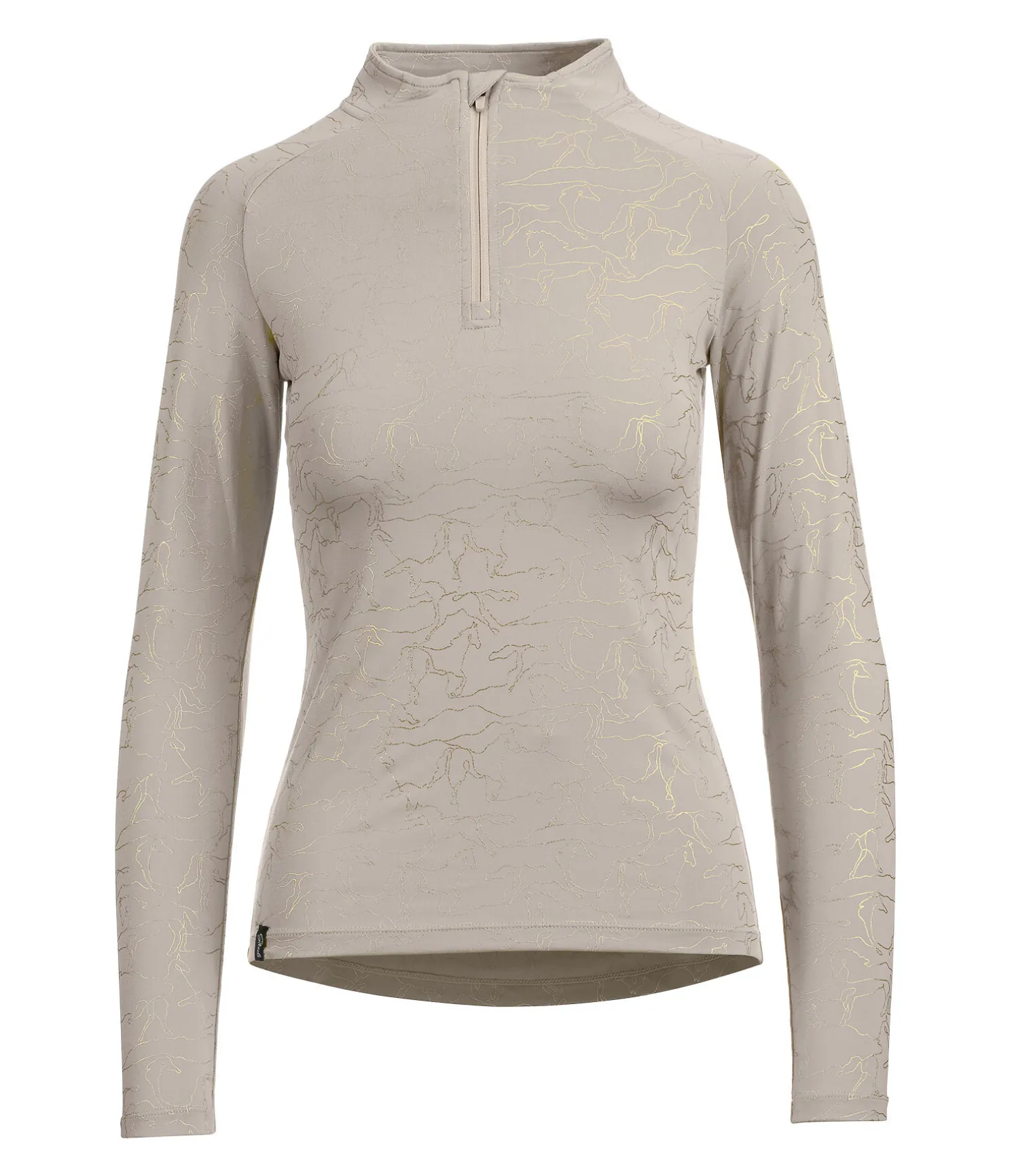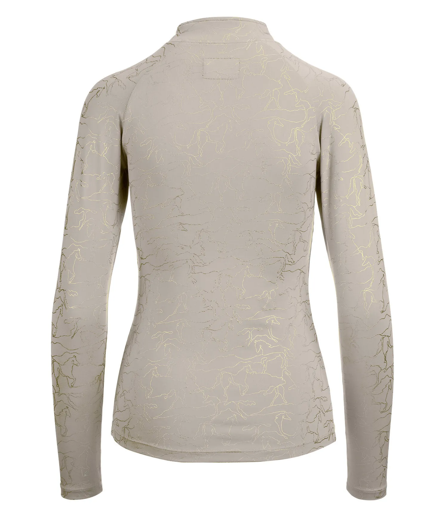 T-shirt technique à manches longues. Imprimé métallisé cheval all-over. Manches raglan. Col montant zippé avec protège-menton. Matière respirante. Séchage rapide. 88 % polyester, 12 % élasthanne.