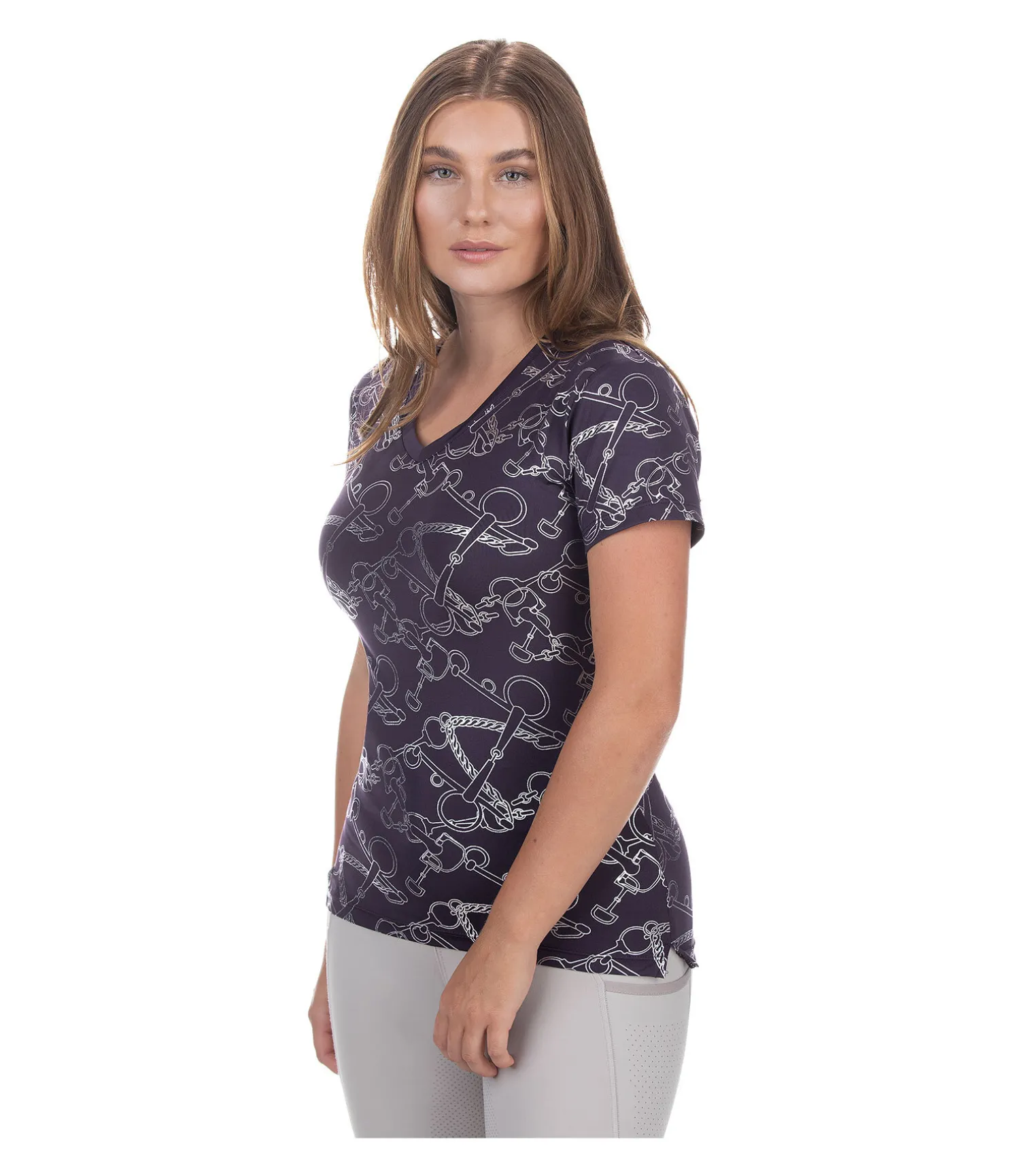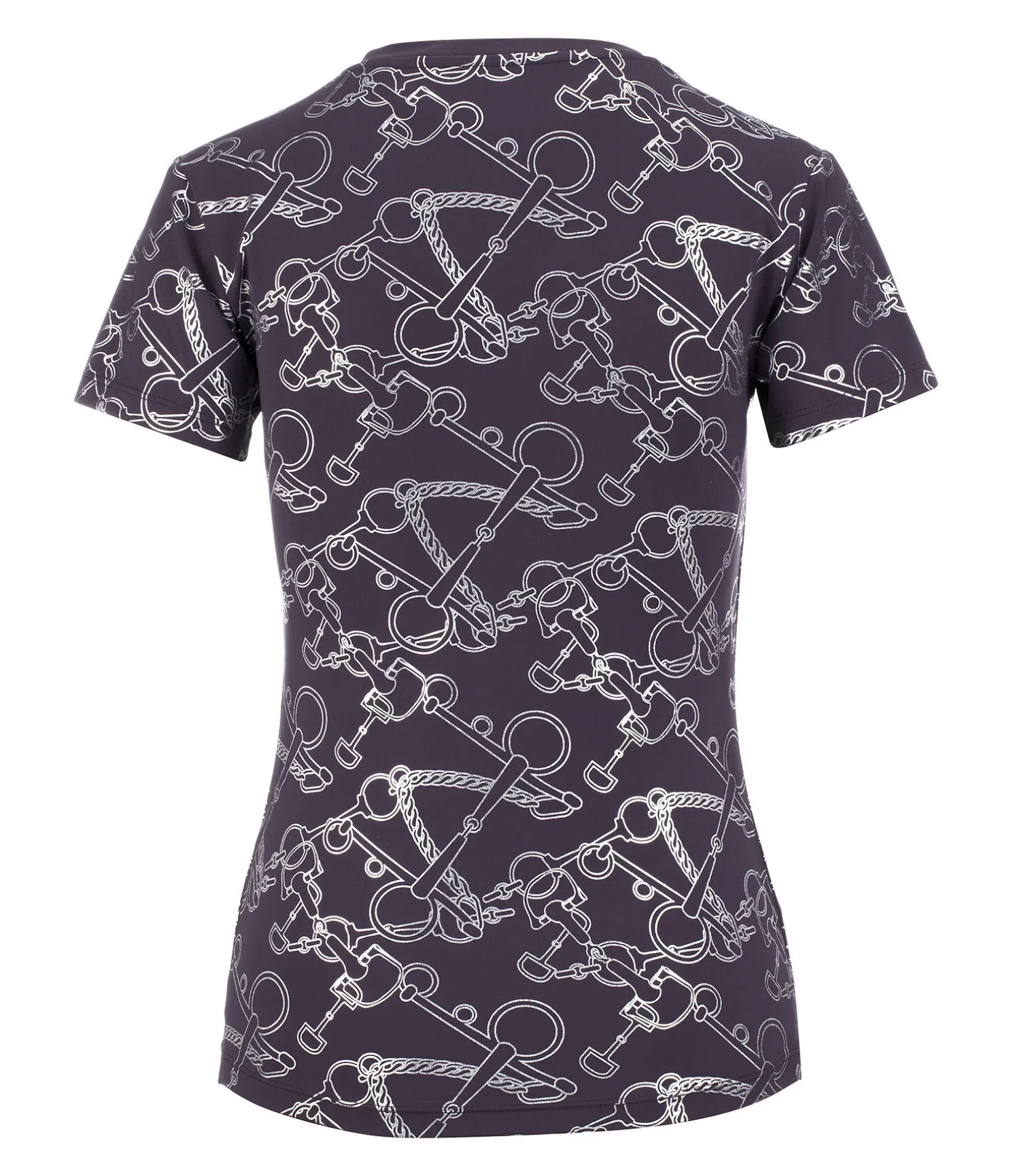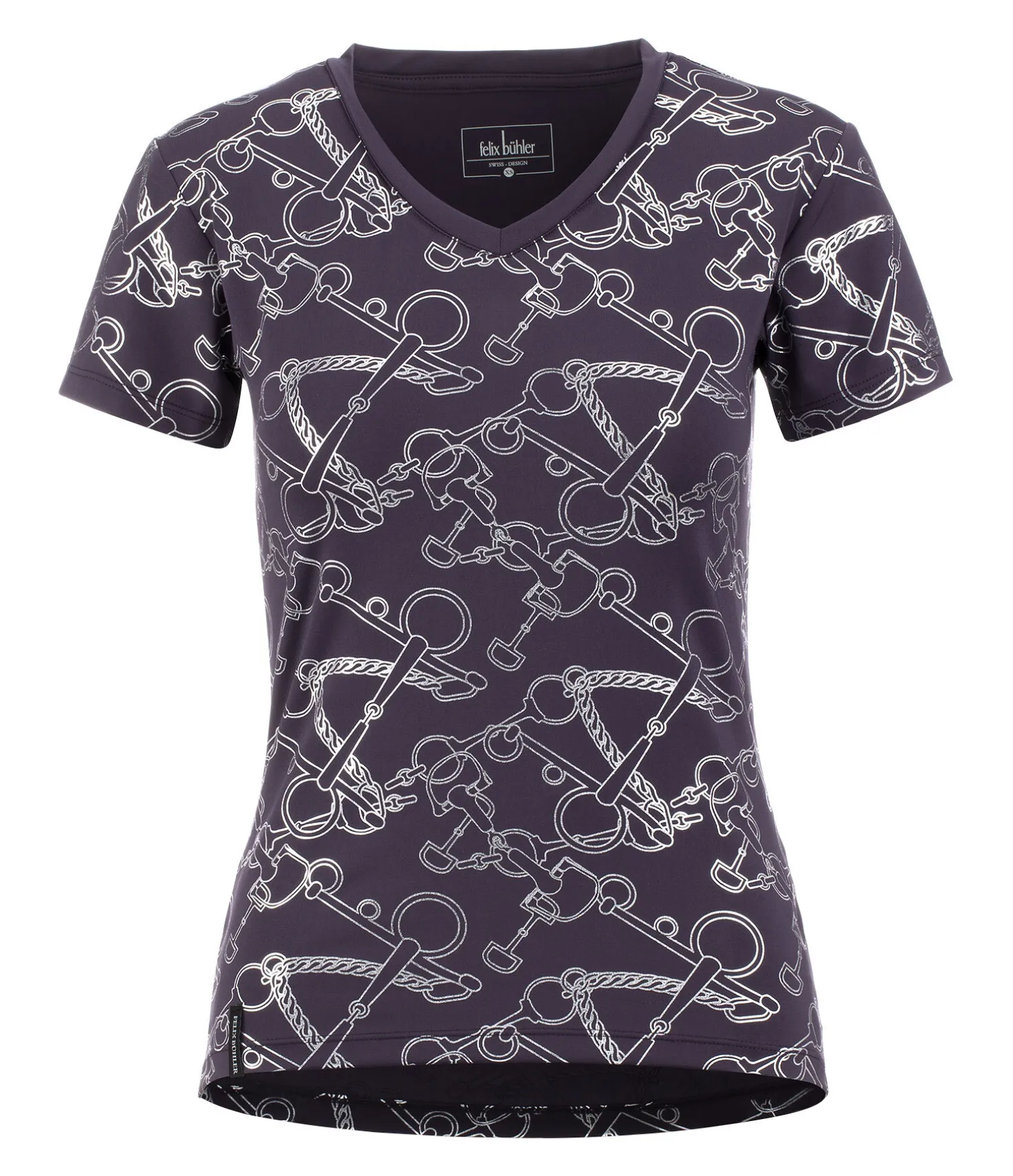 Élégant T-shirt technique à manches courtes. Col en V. Imprimé all-over couleur métallisée. Respirant et à séchage rapide. 88 % polyester, 12 % élasthanne