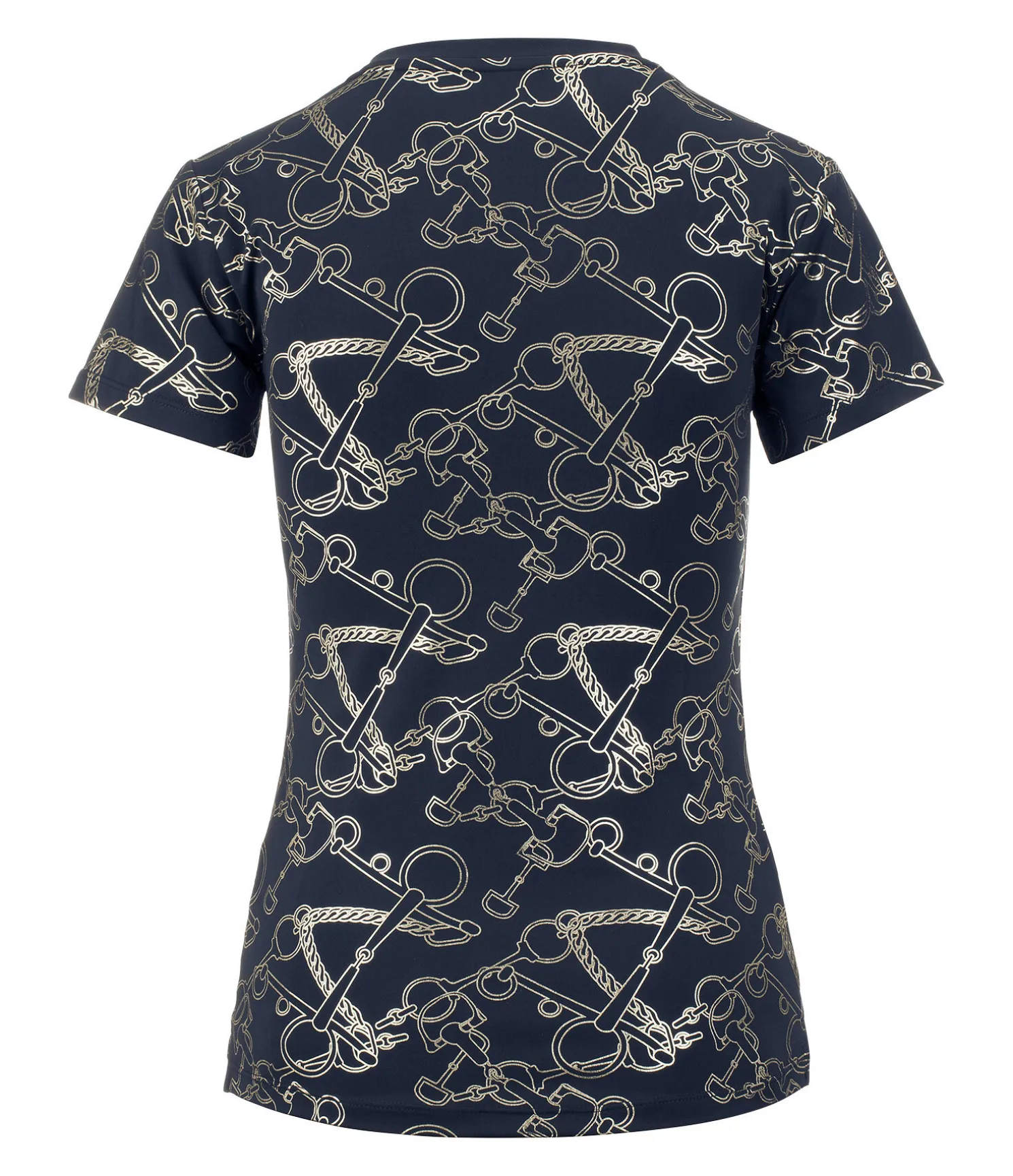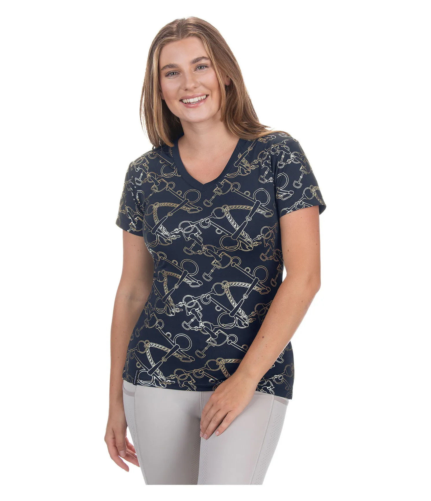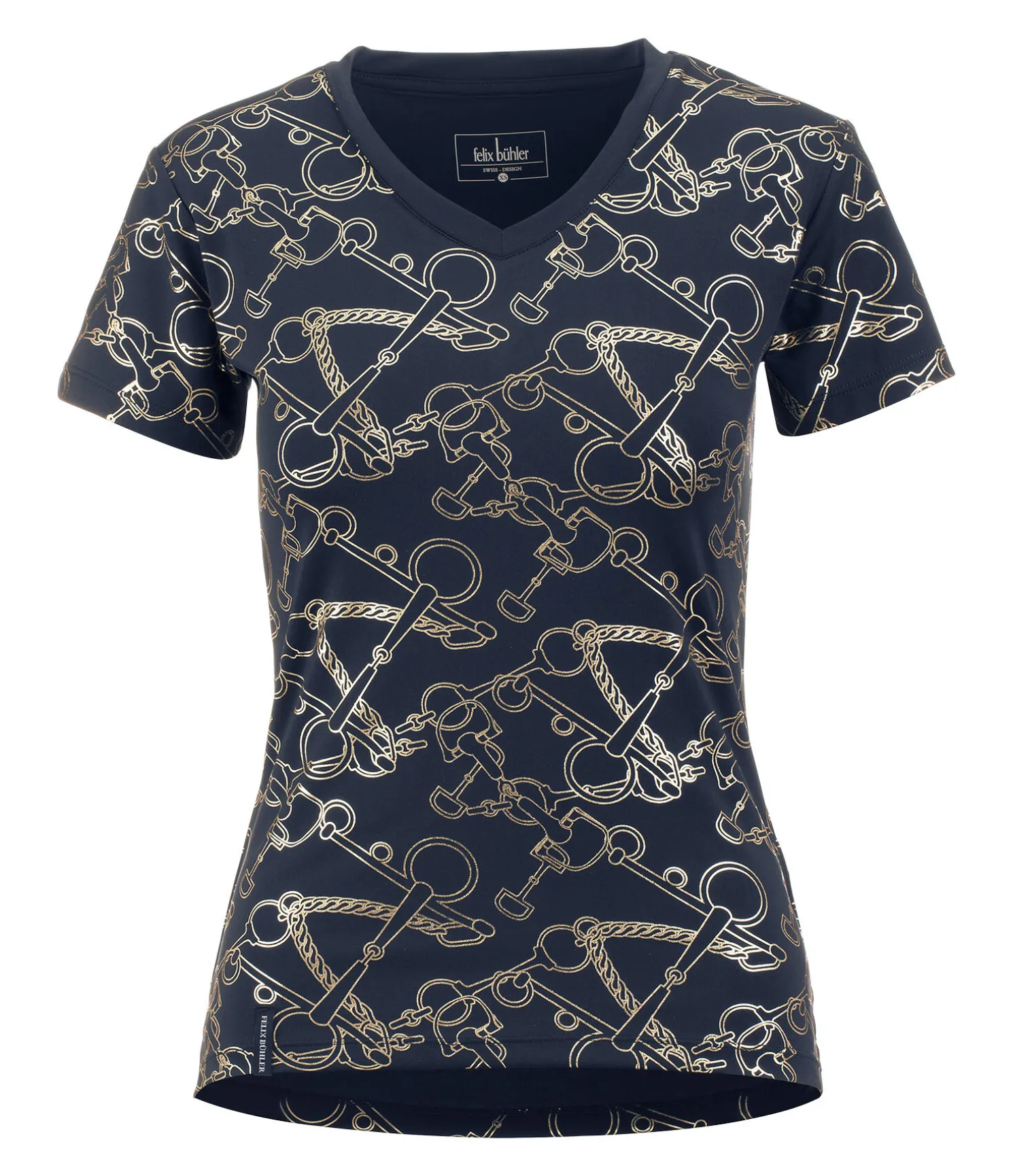 Élégant T-shirt technique à manches courtes. Col en V. Imprimé all-over couleur métallisée. Respirant et à séchage rapide. 88 % polyester, 12 % élasthanne