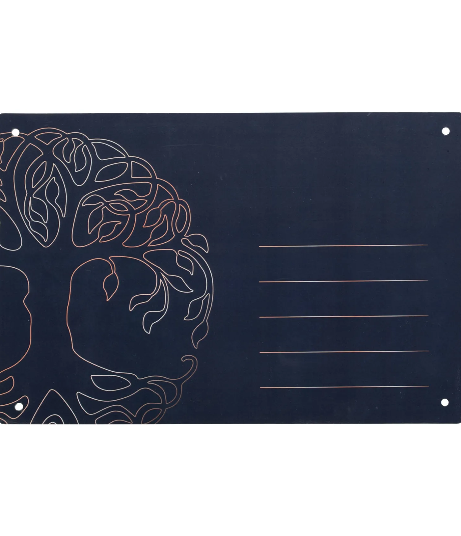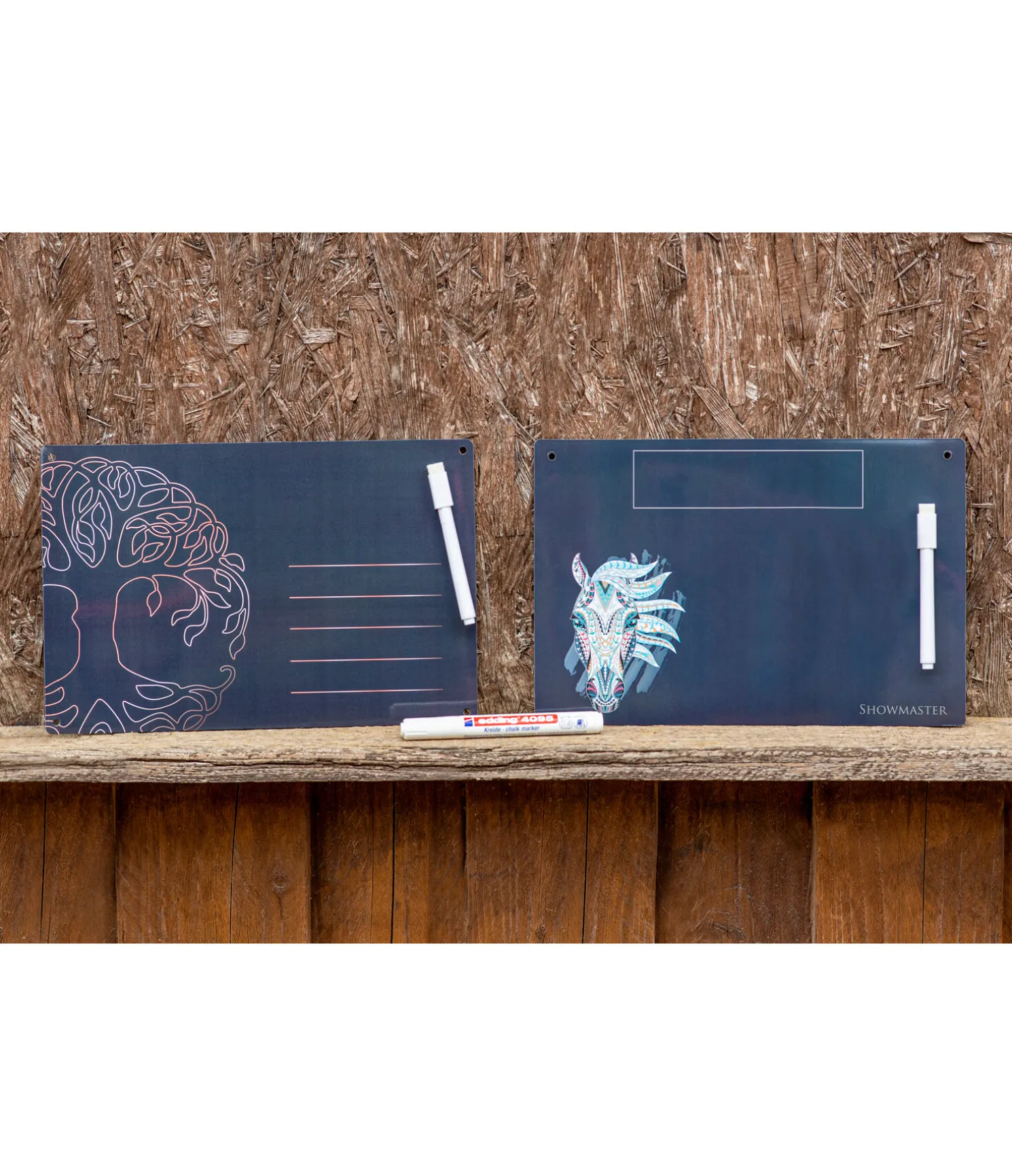 Tableau d’écurie effaçable avec joli motif arbre de vie rose doré. Les quatre lignes offrent suffisamment d’espace pour toutes les informations importantes sur le cheval et le propriétaire. Livré avec un marqueur magnétique. Deux oeillets pratiques pour le suspendre. 30 x 20 cm.