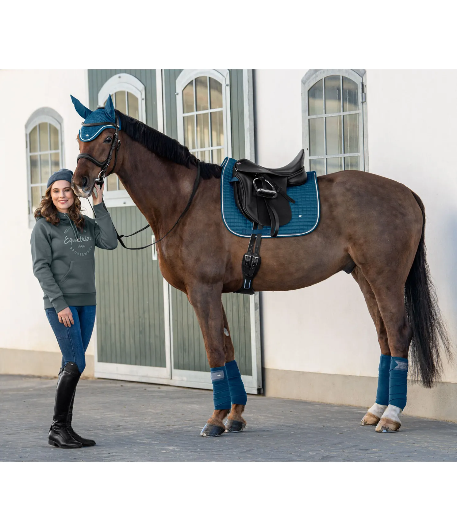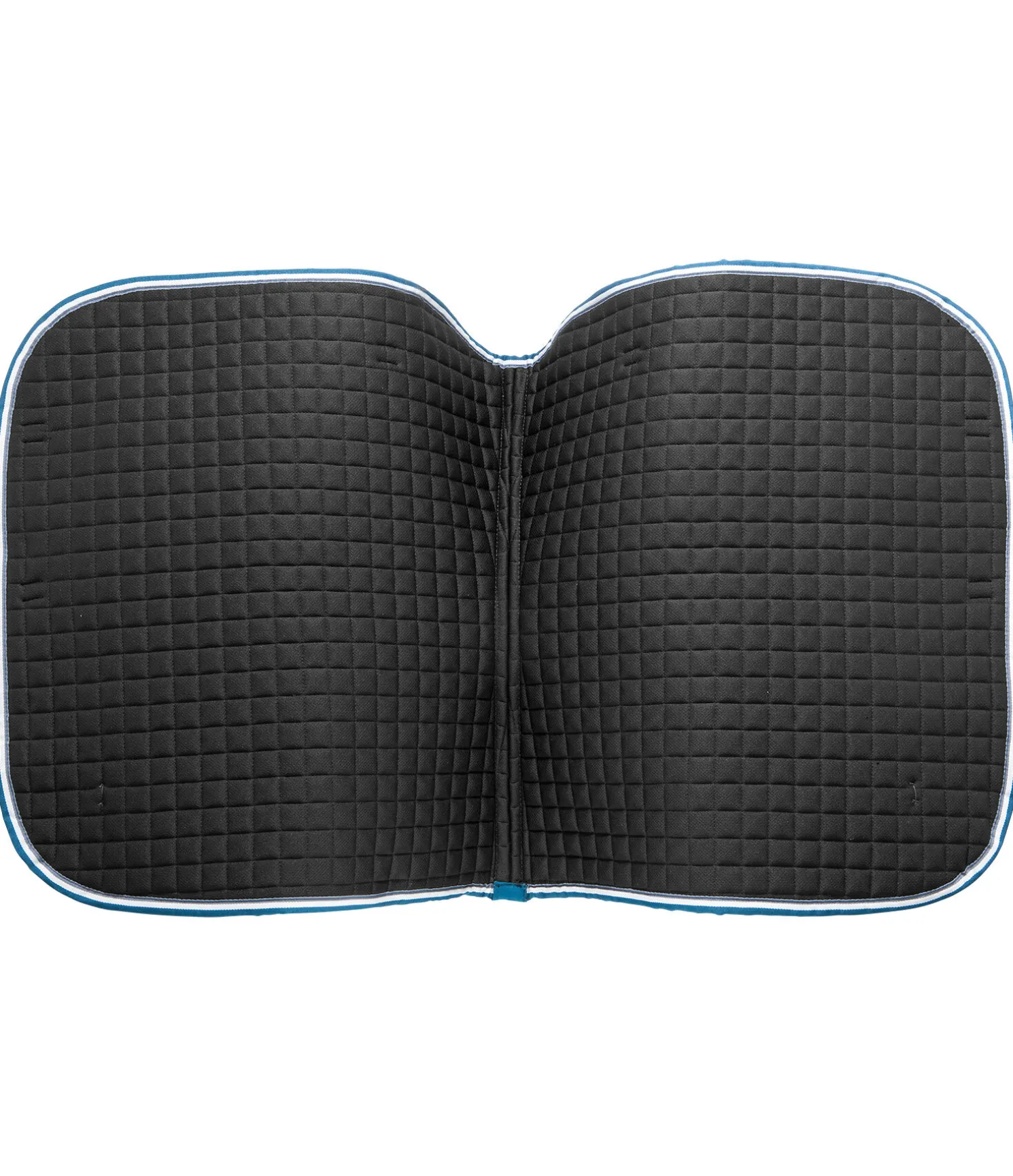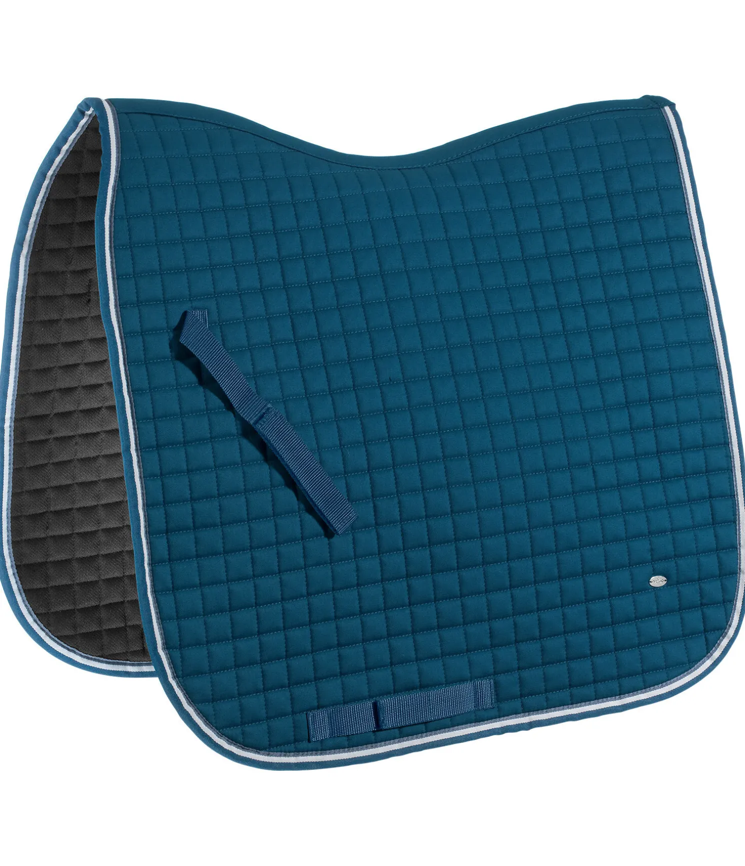 Tapis de selle en coton sobre et indéformable grâce au matelassage resserré, avec bordure colorée et petite plaque métallique argentée avec logo gravé. Passants de sangle et de contre-sanglons avec patte auto-agrippante pratique. Dessous en Air mesh respirant et absorbant l’humidité. Dessus 100 % coton, rembourrage et dessous 100 % polyester.