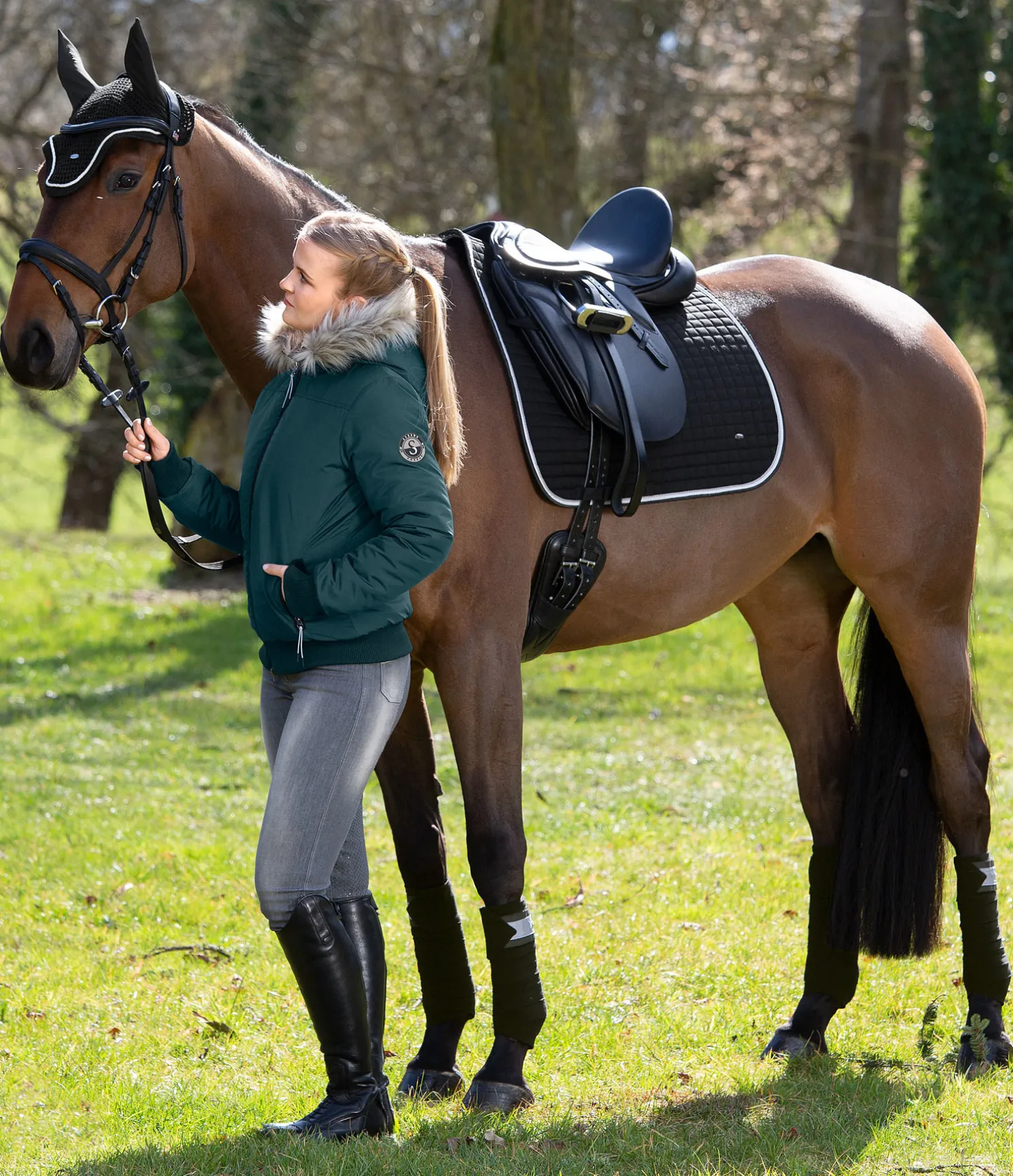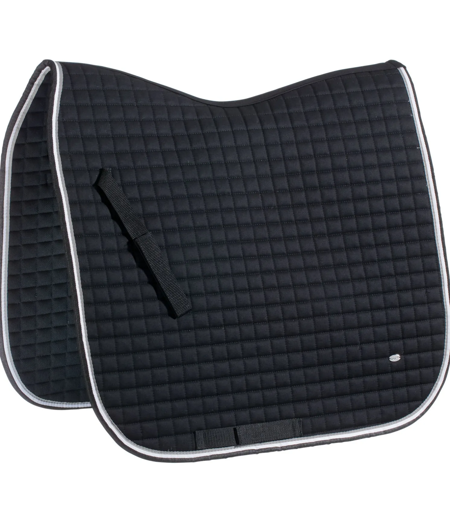 Tapis de selle en coton sobre et indéformable grâce au matelassage resserré, avec bordure colorée et petite plaque métallique argentée avec logo gravé. Passants de sangle et de contre-sanglons avec patte auto-agrippante pratique. Dessous en Air mesh respirant et absorbant l’humidité. Dessus 100 % coton, rembourrage et dessous 100 % polyester.