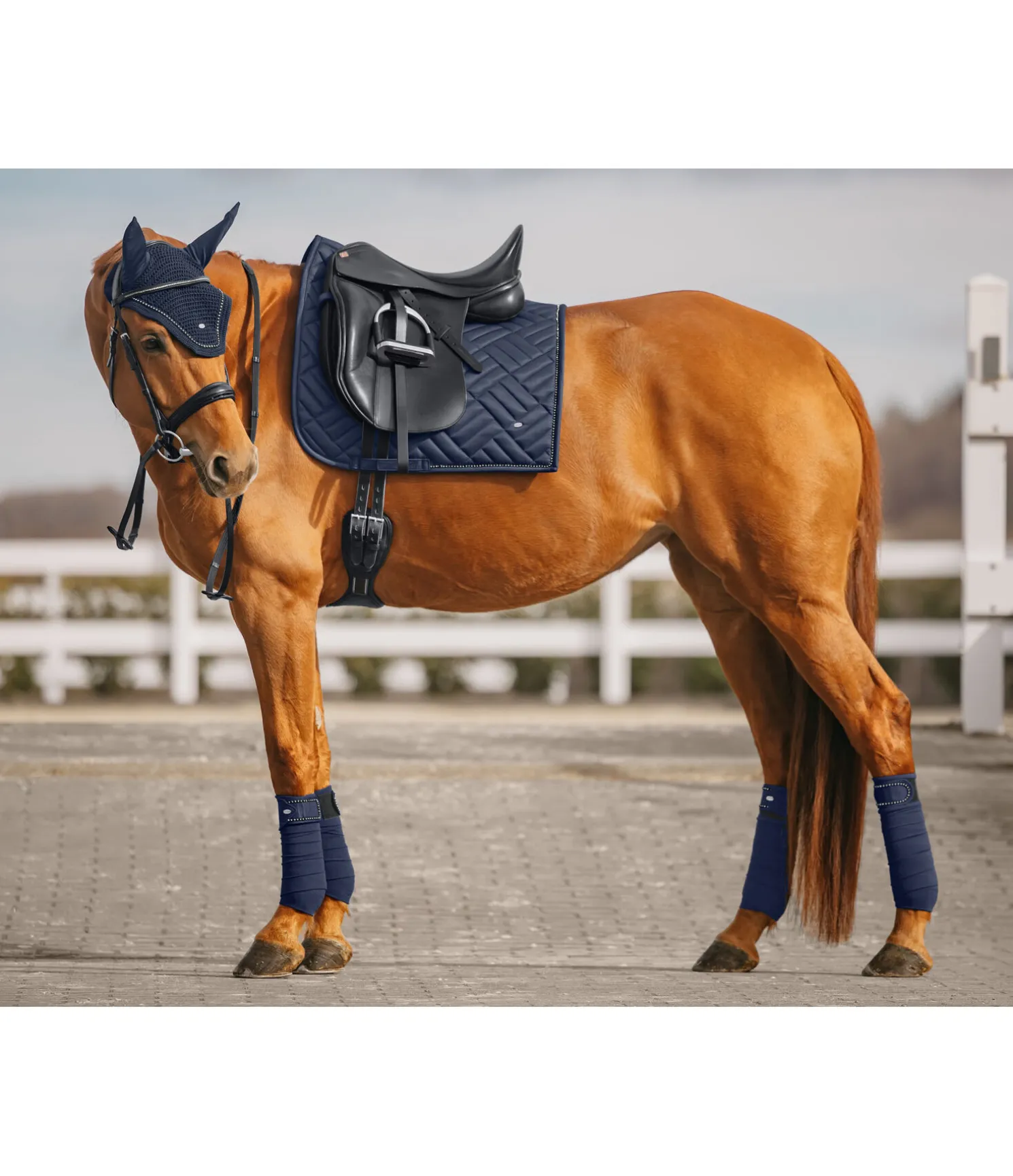 Tapis de selle de forme carrée, particulièrement élégant, avec surpiqûres apparentes. Passepoil avec strass. Petit médaillon discret avec logo gravé. Passants de sangle et de contre-sanglons avec patte auto-agrippante fonctionnelle. Dessous Air mesh respirant et absorbant l’humidité. 100 % polyester.