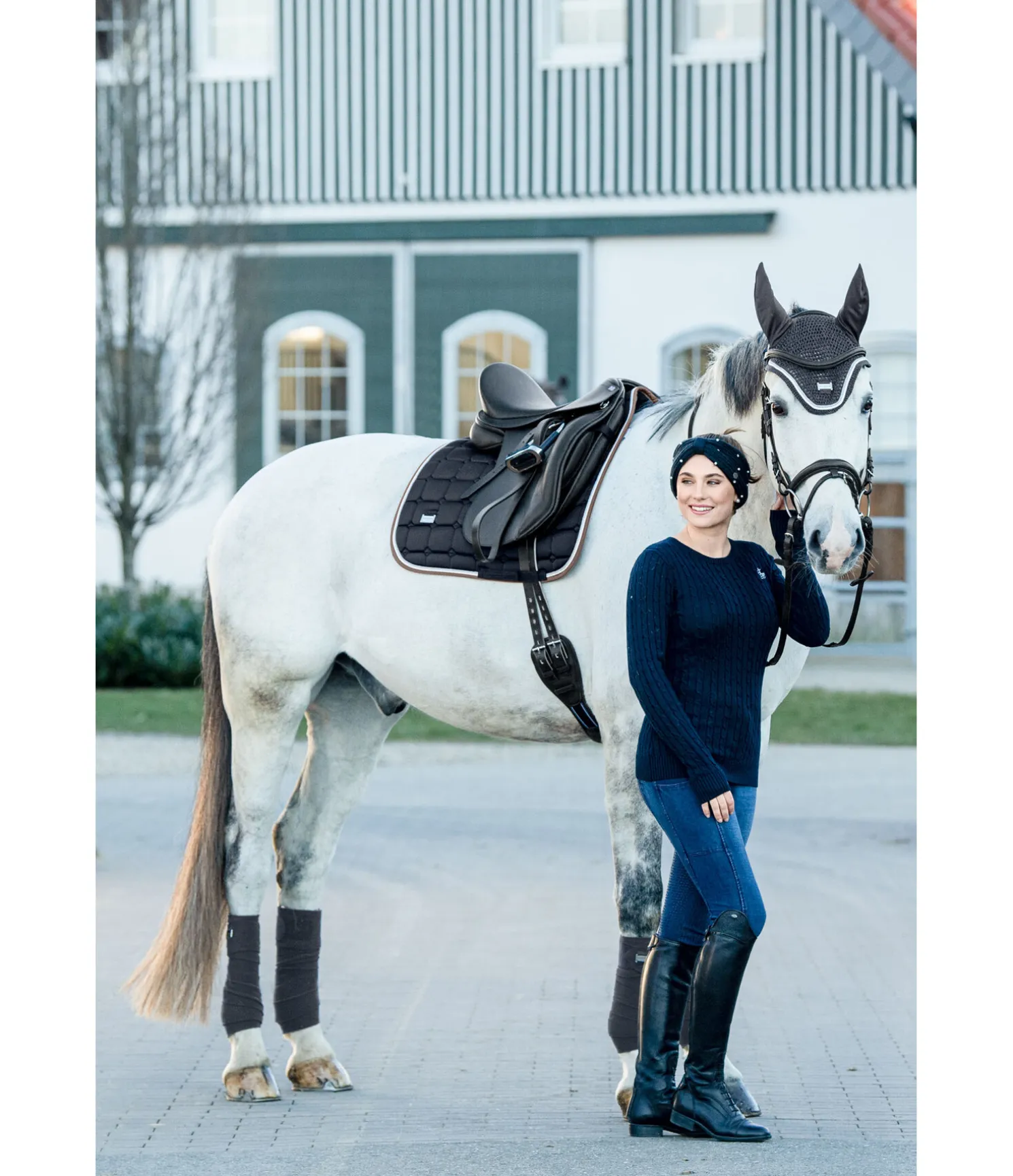 Tapis de selle élégant en tissu satiné et brillant avec grip en silicone dans la zone de la selle pour un maintien idéal. Détails élégants comme le double cordon décoratif et une plaque métallique de couleur assortie avec logo de chaque côté. Passants de sangle et de contre-sanglons avec patte auto-agrippante pratique. Doublure en mesh respirant et absorbant l’humidité. 100 % polyester.