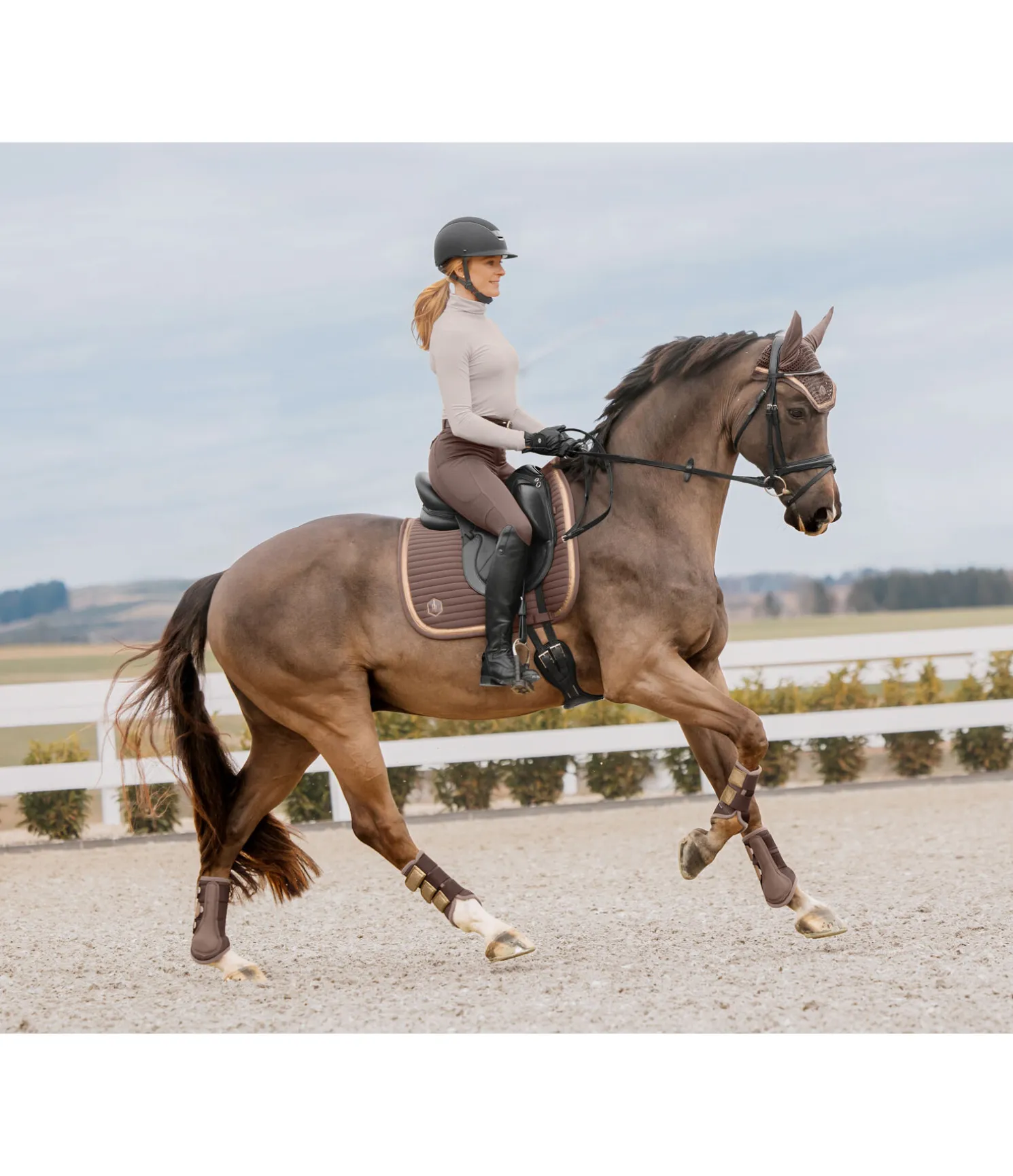 Tapis de selle élégant et sportif avec bande scintillante de couleur assortie et logo ton sur ton. Insert en mesh particulièrement respirant le long du dos pour une aération optimale. Dessus en matière lisse, souple et anti-salissures. Surpiqûre horizontale sportive. Passants de sangle et de contre-sanglons avec pattes auto-agrippantes pratiques. Dessous en Air mesh respirant et absorbant l’humidité. 100 % polyester.