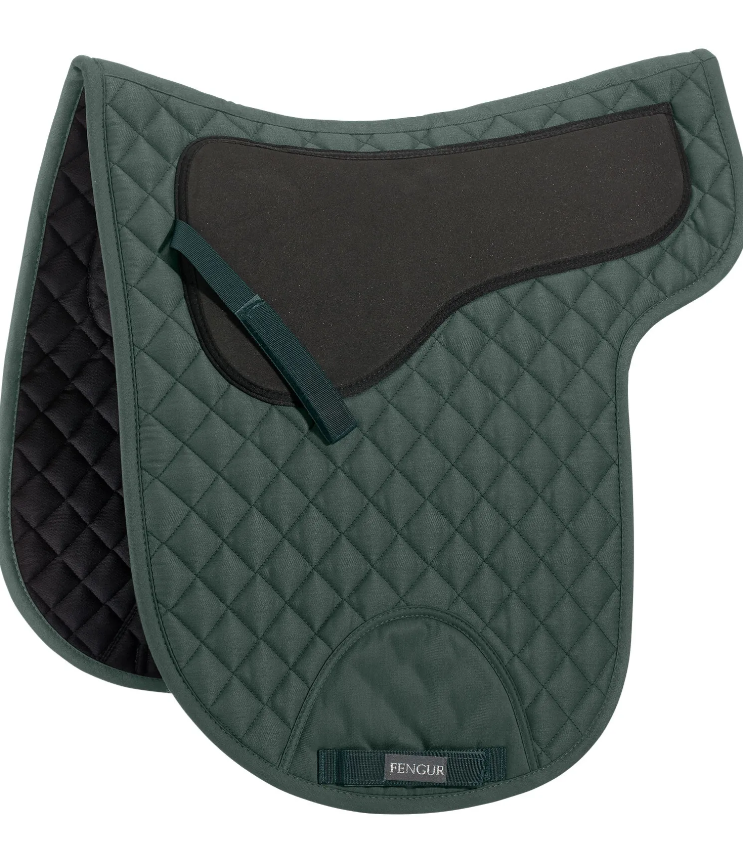 Tapis de selle en forme anatomique. Matière respirante. Pad en mousse cousu pour soulager le dos du cheval et empêcher la selle de glisser. Passage de contre-sanglons avec patte auto-agrippante. Longueur du dos 56 cm, hauteur 56 cm. 80 % polyester, 20 % coton.