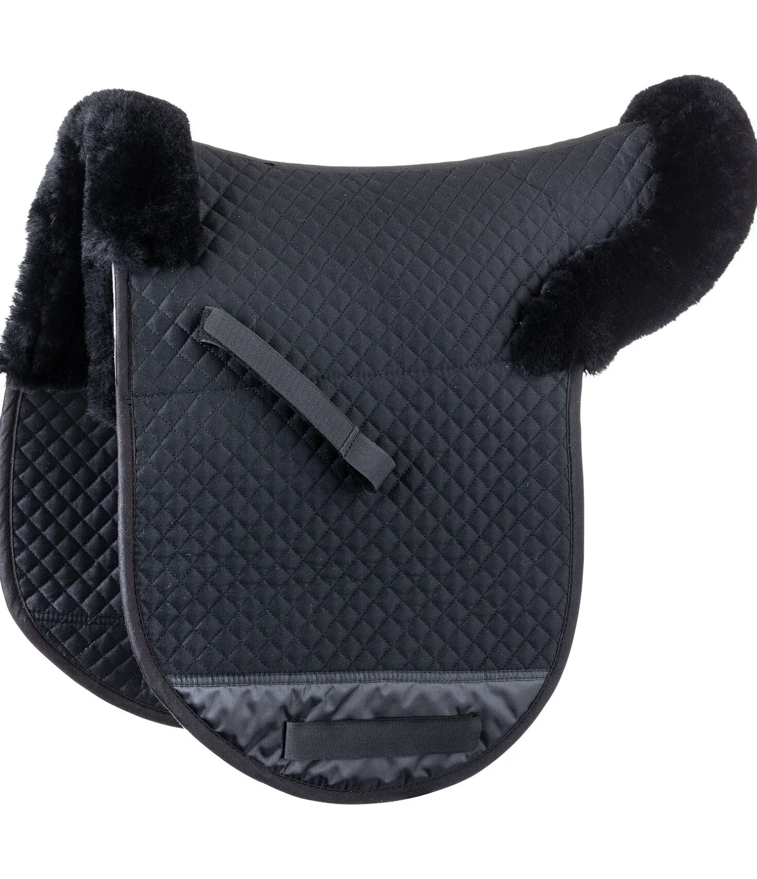 Tapis de selle de grande qualité avec dessous et bordures en véritable fourrure d’agneau. Idéal pour les chevaux sensibles. Longueur de dos 57 cm, hauteur 57 cm. Tissu matelassé souple et véritable fourrure d’agneau à tannage médical.