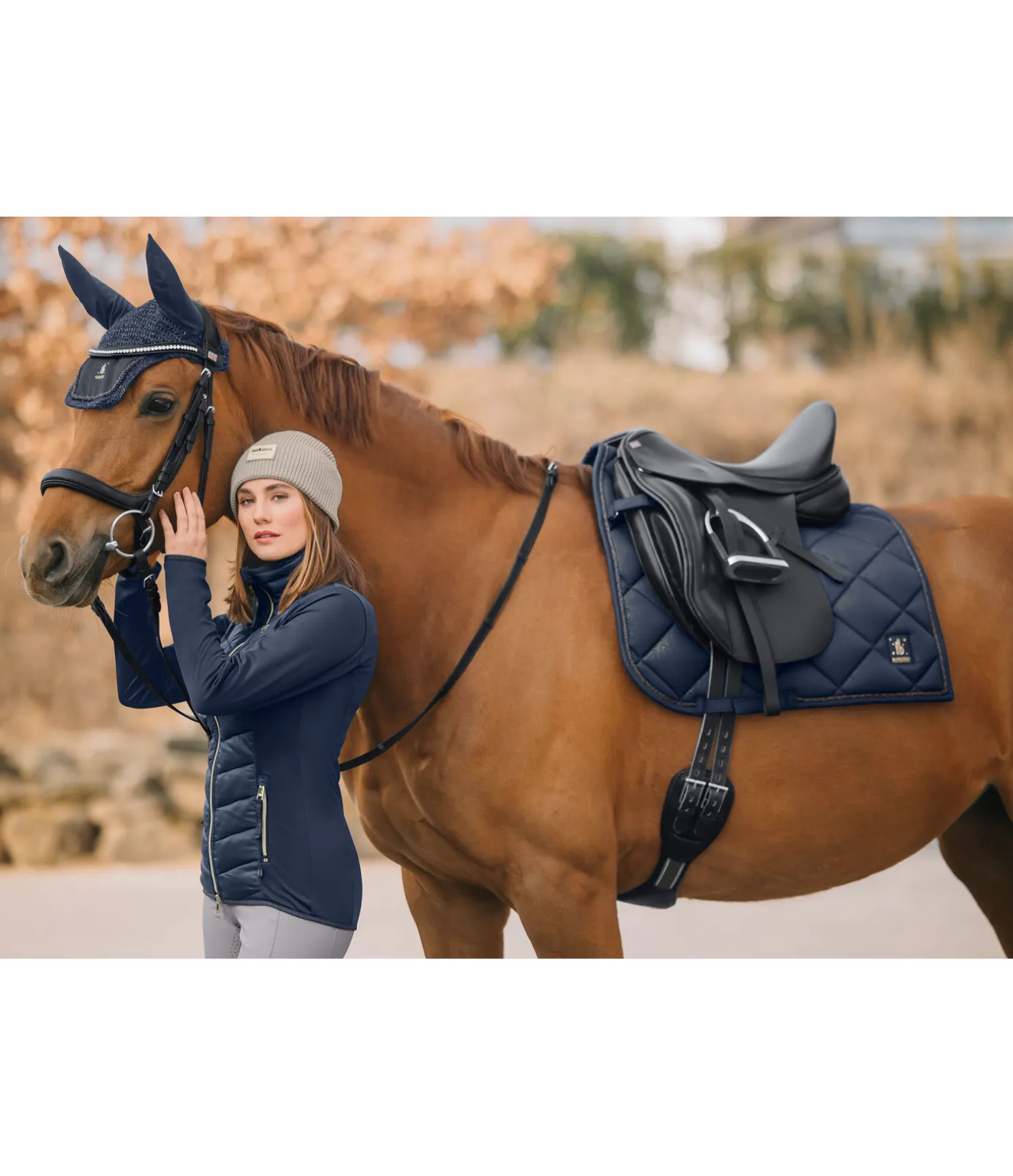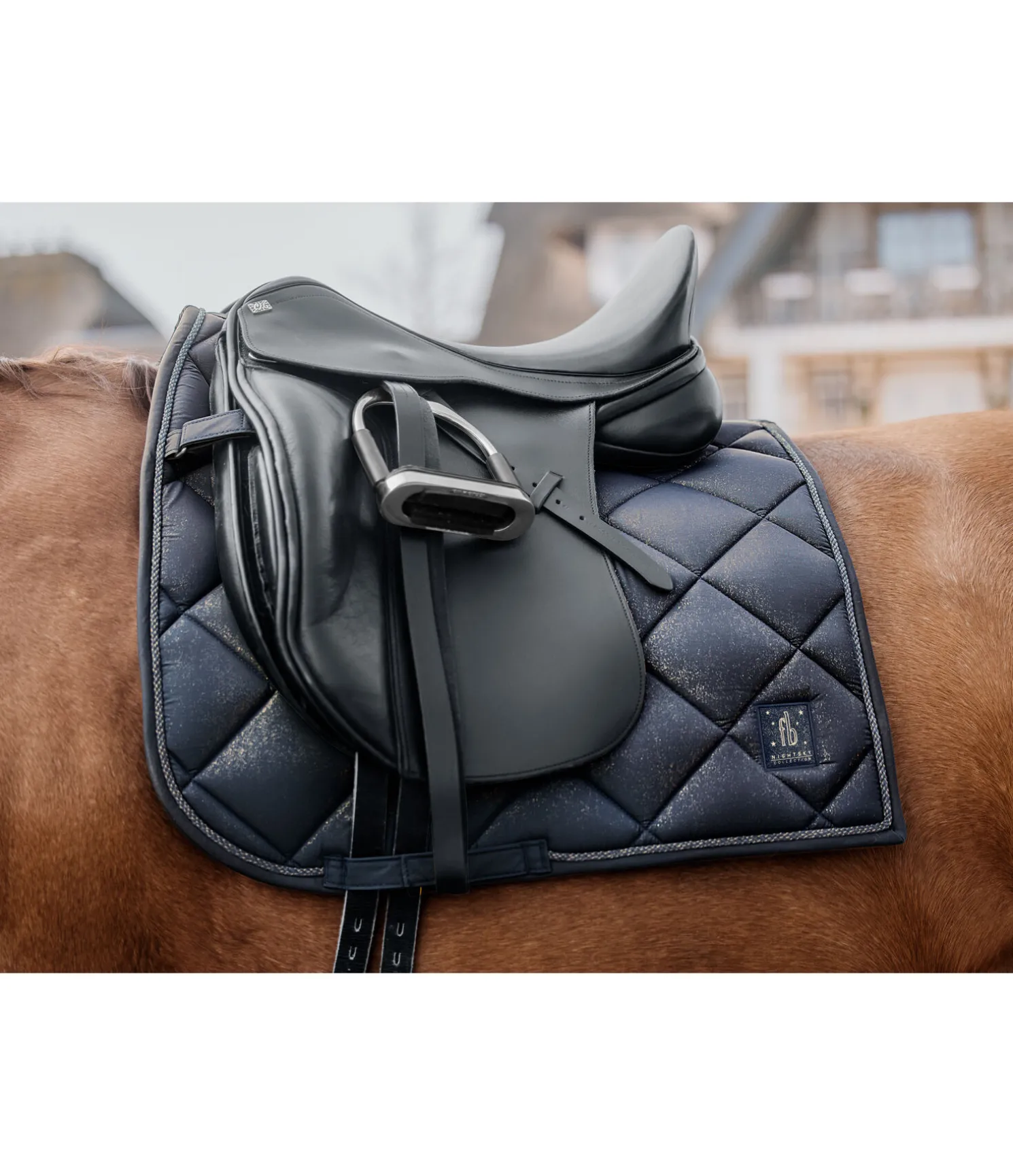 Élégant tapis de selle de forme carrée avec un soupçon de paillettes sur toute la matière supérieure et cordon décoratif scintillant. Logo de couleur assortie. Passants de contre-sanglons amovibles et passants de sangle avec pattes auto-agrippantes pratiques. Dessous en Air mesh respirant et absorbant l’humidité.