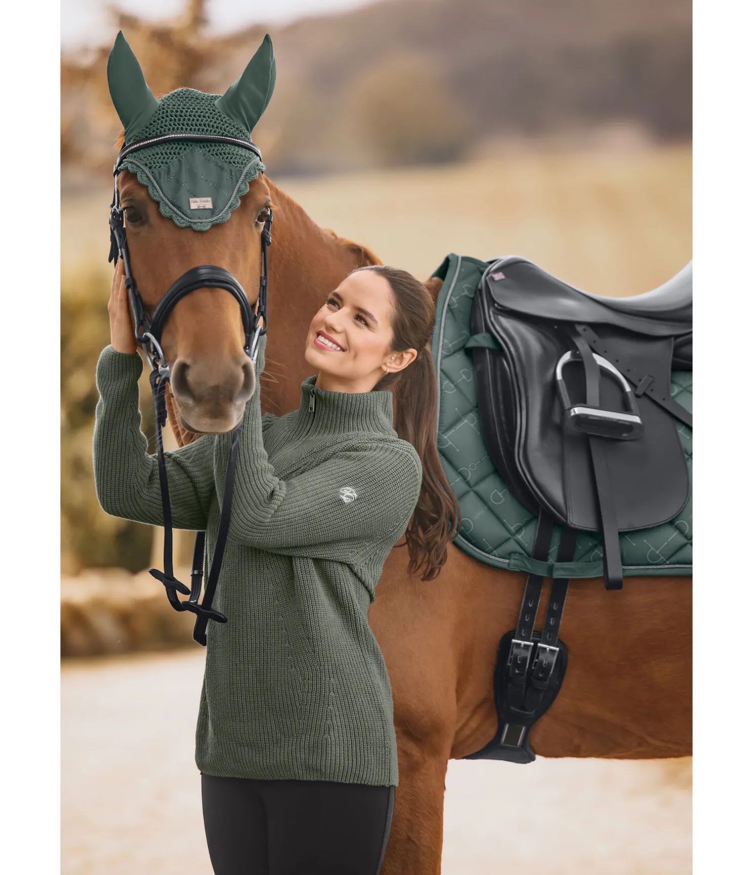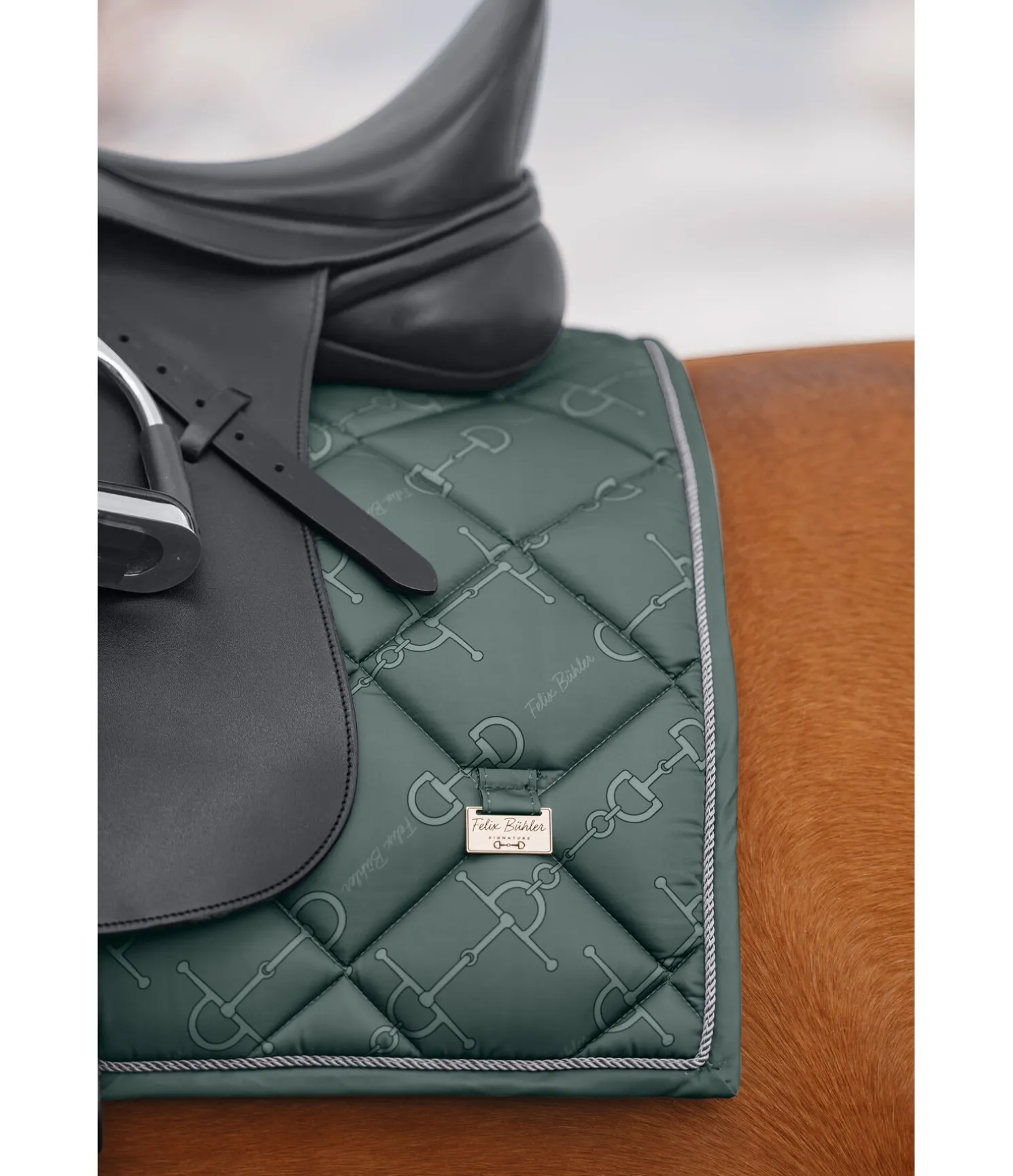 Élégant tapis de selle de forme carrée avec plaque logo métallique de chaque côté. Cordon décoratif anthracite et imprimé all-over discret à motif mors tendance. Passants de sangle et de contre-sanglons avec pattes auto-agrippantes pratiques. Dessous en Air mesh respirant et absorbant l’humidité. 100 % polyester.