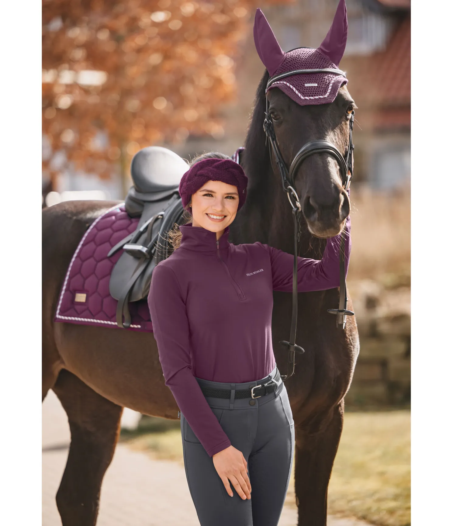 Tapis de selle avec rembourrage à l’avant permettant de garder la selle en place sans passants de contre-sanglons. Coupe sportive avec angle droit et surpiqûre en losanges. Dessus en matière lisse anti-salissures, cordon décoratif de couleur assortie et plaque logo métallique classique. Passants de sangle avec patte auto-agrippante pratique. Dessous en Air mesh respirant et absorbant l’humidité. 100 % polyester.