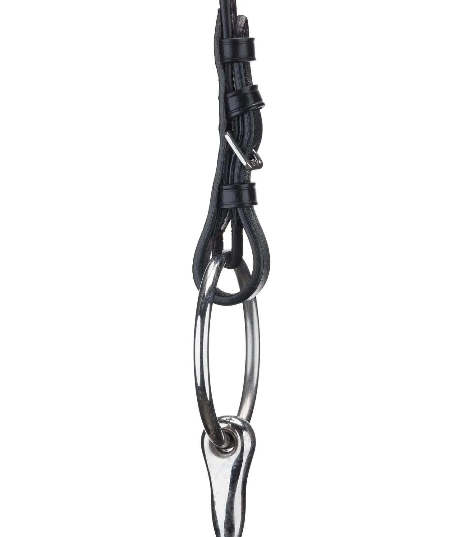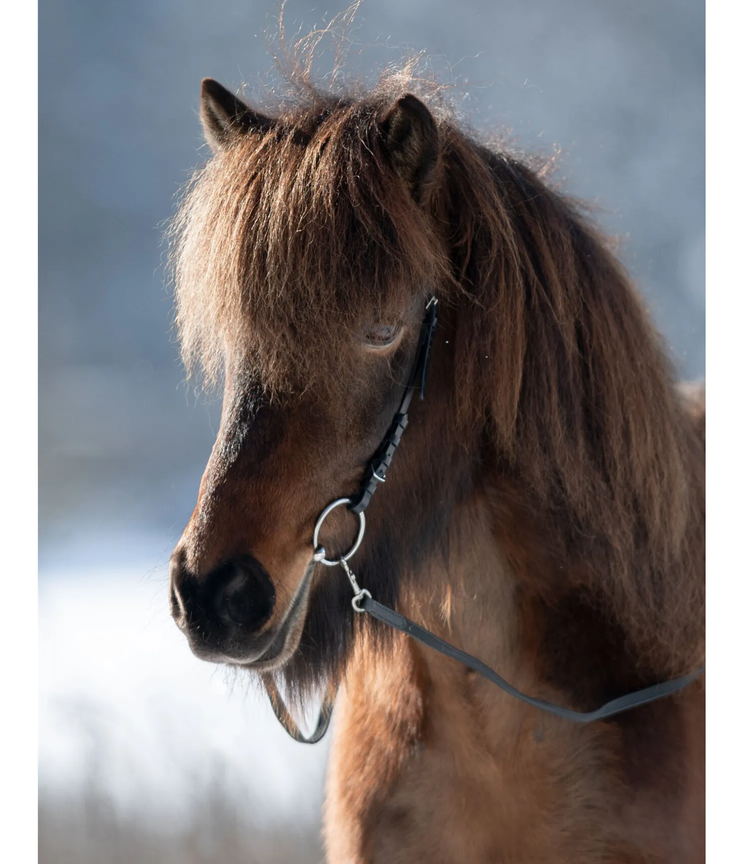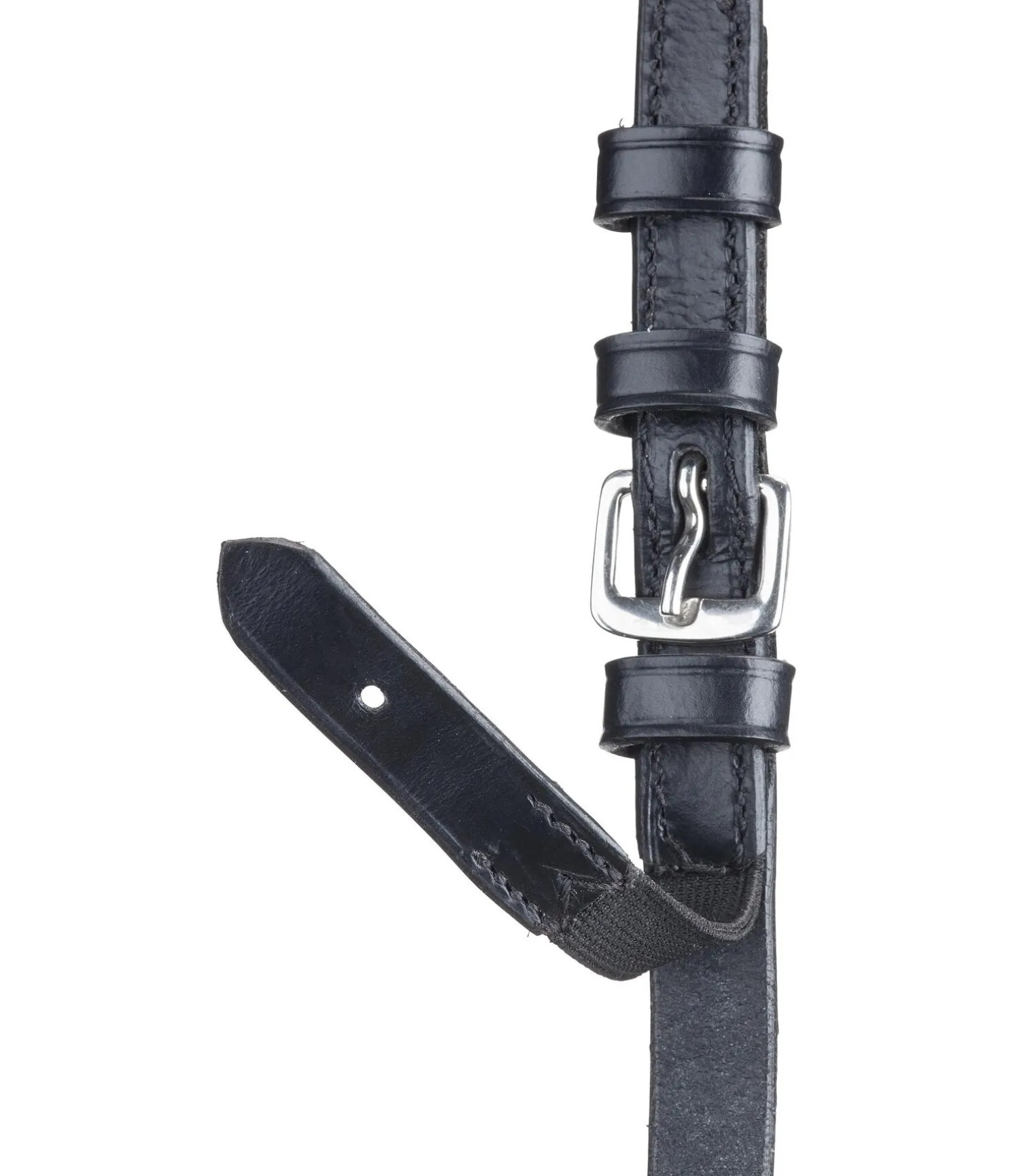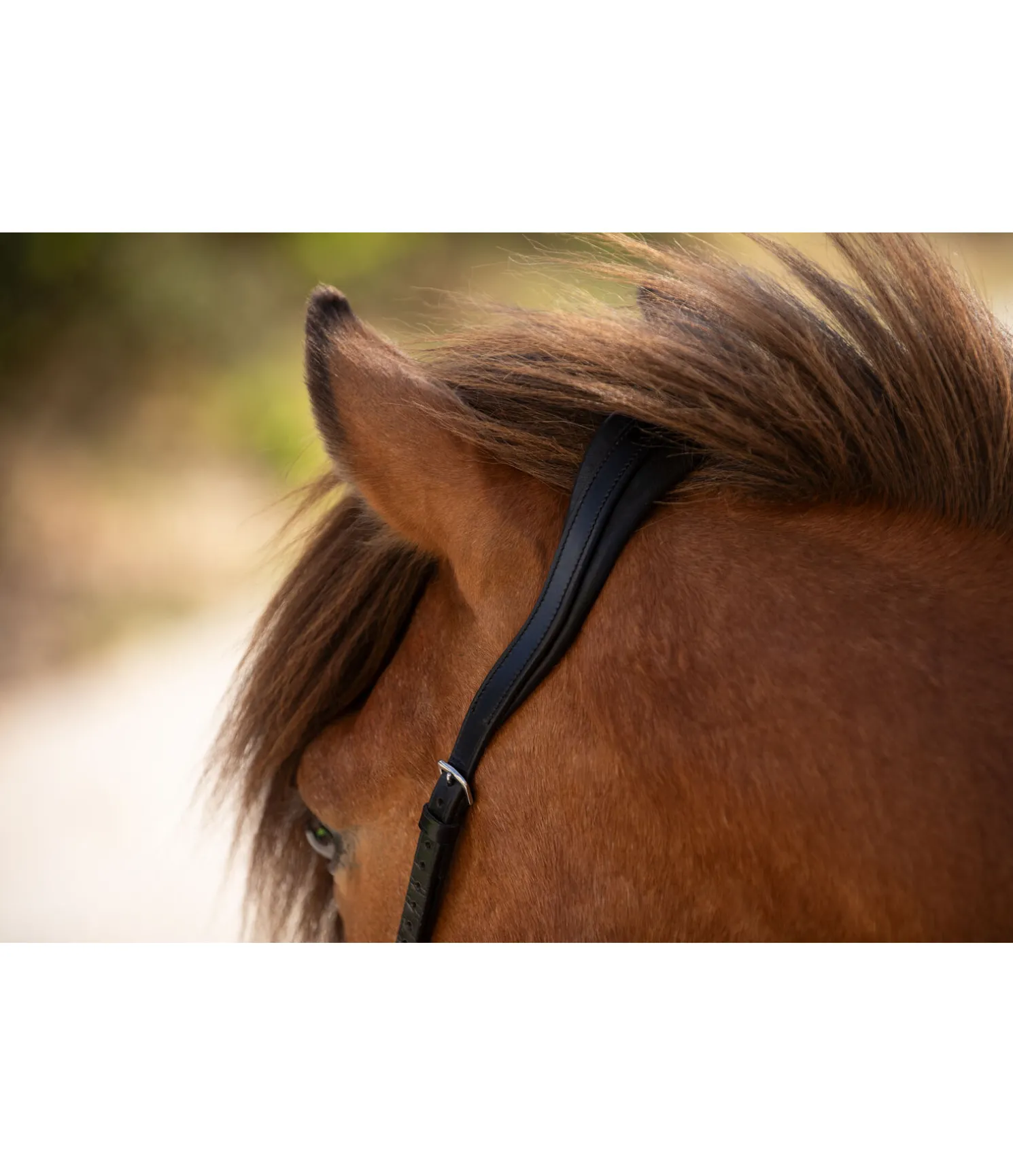 Têtière anatomique en cuir gras. Doublure moelleuse au niveau de la nuque. Les boucles élastiquées pour le mors assurent une position stable dans la bouche du cheval et soulagent la nuque.