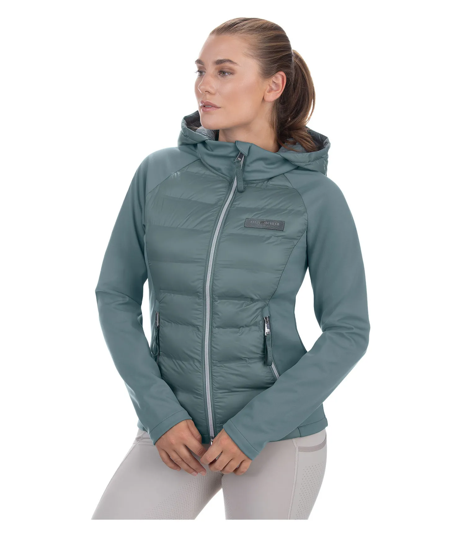 Veste d’équitation bi-matière technique. Matelassage doux avec coutures thermosoudées et garnissage léger en imitation duvet. Côtés et manches raglan en softshell extensible. Col montant avec capuche matelassée amovible grâce à une fermeture à glissière. Bouton-pression pour fixer la capuche dans le dos. Fermeture à glissière double sens avec sous-patte et protège-menton. Deux poches latérales zippées. Badge du logo sur la poitrine. 100 % nylon. Softshell et garnissage en imitation duvet 100 % polyester.