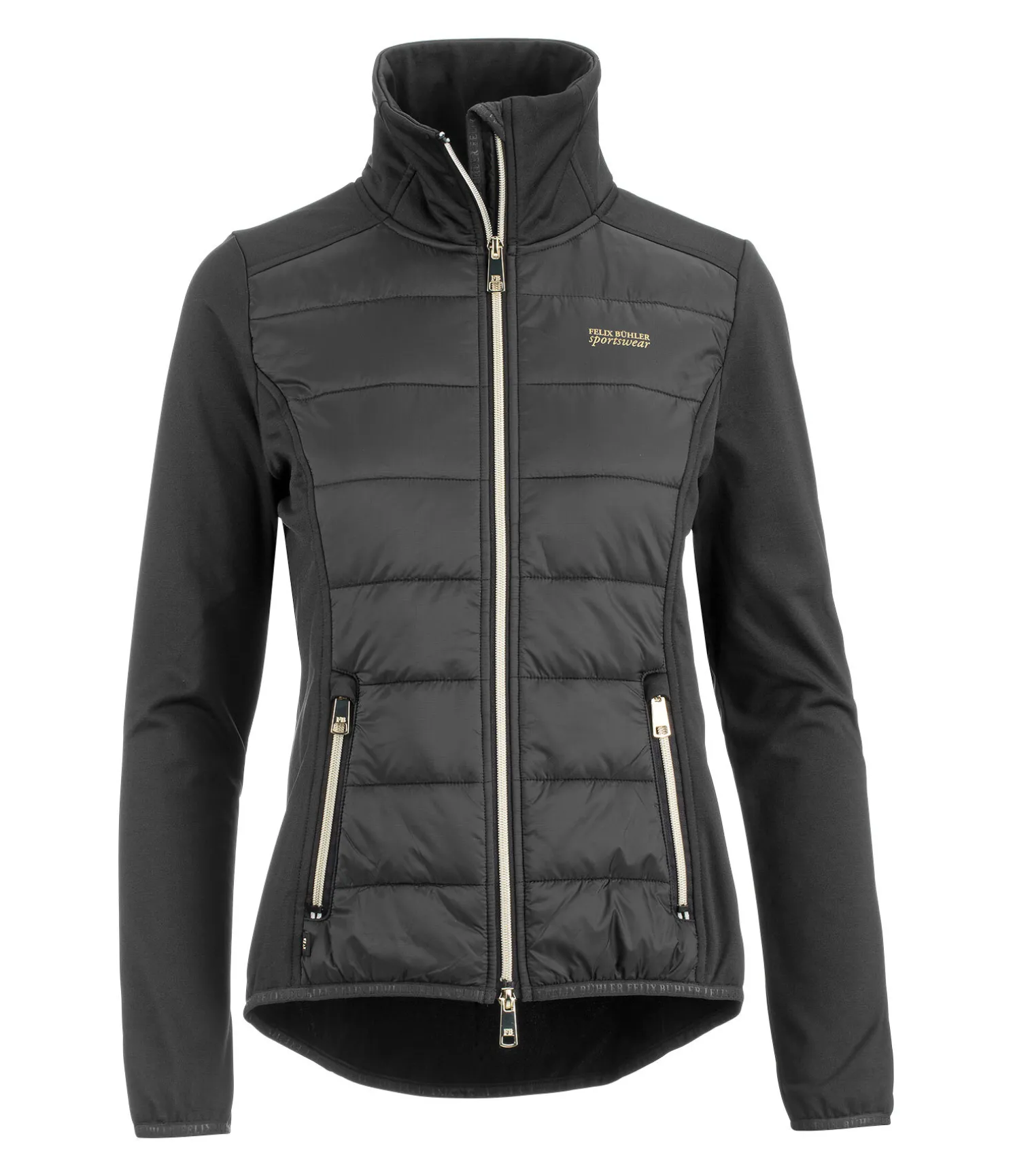 Alliance sportswear entre le nylon résistant légèrement matelassé à l’avant et le tissu stretch Performance très extensible. Le stretch est très respirant, permet un ajustement parfait et une liberté de mouvement optimale en selle. Col montant, fermeture à glissière double sens avec sous-patte et protège-menton. Deux poches latérales zippées. Poignets et taille élastiqués avec signature Felix Bühler. Face avant 100 % nylon ; stretch Performance 90 % polyester, 10 % élasthanne.
