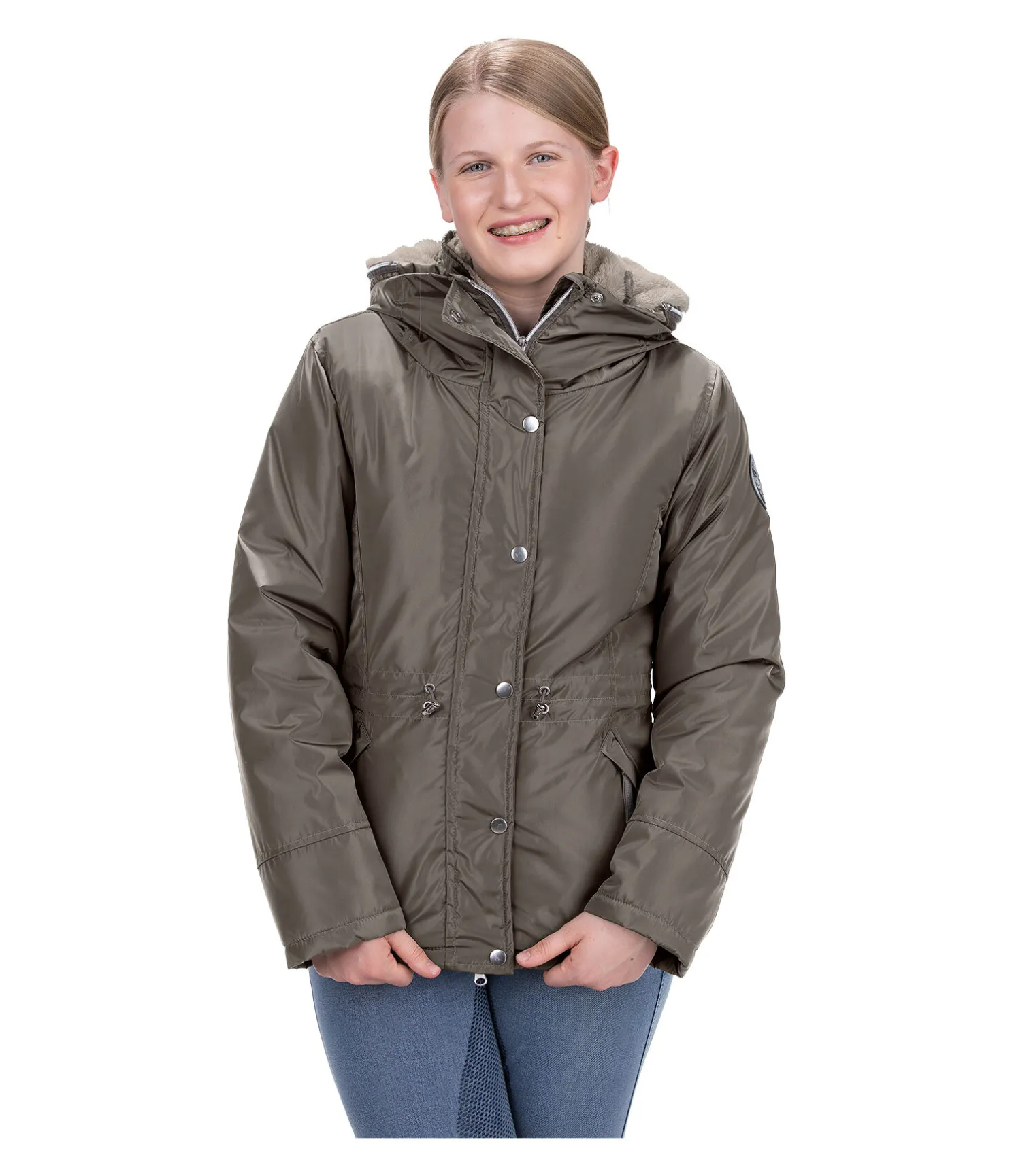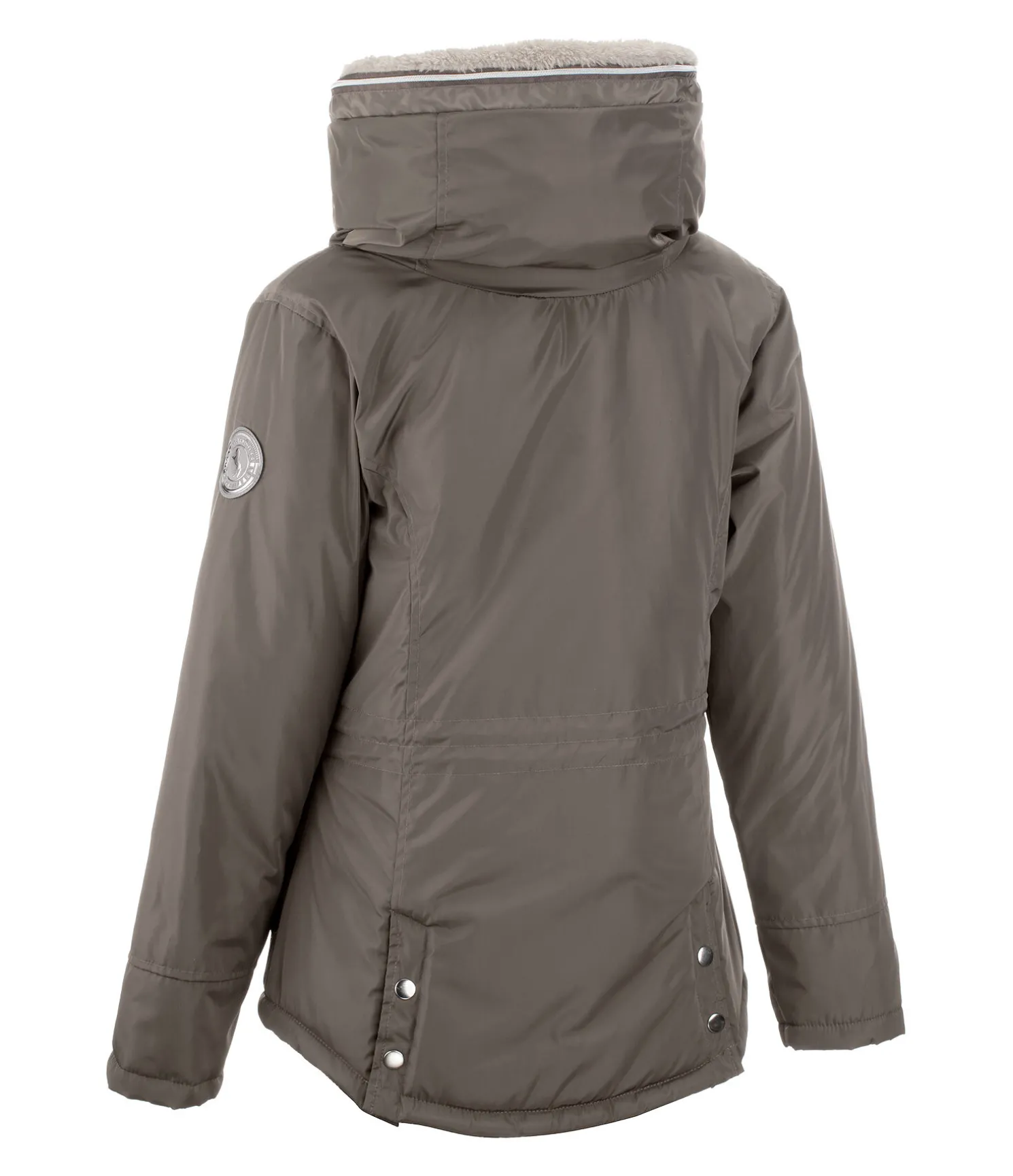 Veste d’équitation d’hiver technique, déperlante et coupe-vent. Matière respirante et chaude. Large col et capuche amovible doublés en polaire Teddy douce. Capuche rétractable dans le large col. Garnissage imitation duvet. Fermeture à glissière double sens dissimulée avec protège-menton. Deux poches zippées latérales dissimulées et une poche intérieure. Taille ajustable. Deux fentes cavalières avec boutons-pression à l’arrière. Badge logo Felix Bühler sur la manche. Fermeture à glissière et boutons-pression rose doré. 100 % polyester.