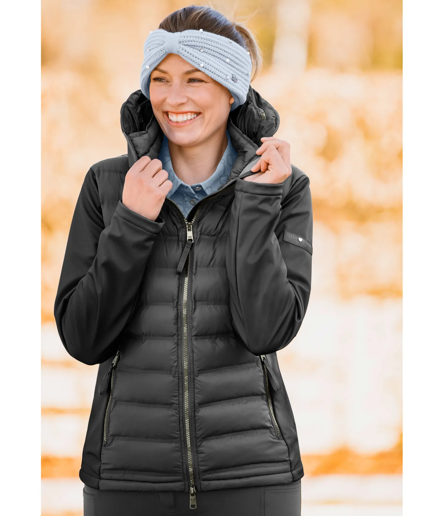 Superbe combinaison de softshell extensible et de nylon avec un garnissage très doux en imitation duvet devant et derrière. Coupe-vent. Double col et capuche rembourrée repliable dans le large col extérieur par fermeture à glissière. Coutures thermosoudées, fermeture à glissière double sens avec sous-patte et protège-menton, 2 poches zippées devant. Logo élaboré sur la manche et le col. Avant, dos, col intérieur et capuche 100 % nylon, matière softshell 92 % polyester, 8 % élasthanne.
