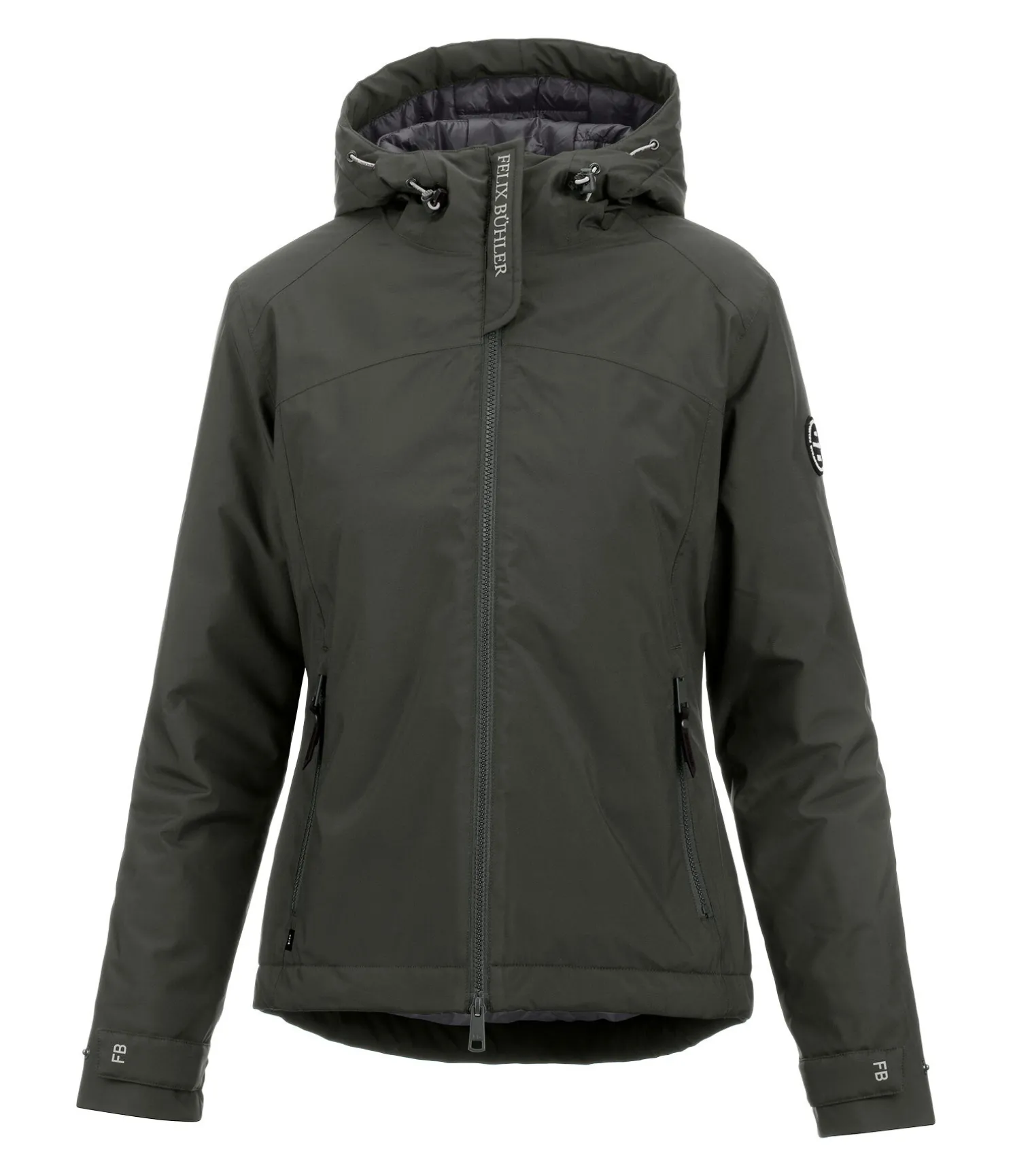 Courte veste d’équitation technique avec garnissage chaud en imitation duvet. Imperméable (10.000 mm), coupe-vent et respirante. 2 poches zippées devant, 1 poche intérieure zippée, fermeture à glissière double sens avec sous-patte, taille et bas des manches réglables, col haut avec capuche rembourrée réglable et pouvant être fixée dans le dos. Badge Felix Bühler sur la manche et imprimé réfléchissant Felix Bühler sur le col. 100 % polyester.