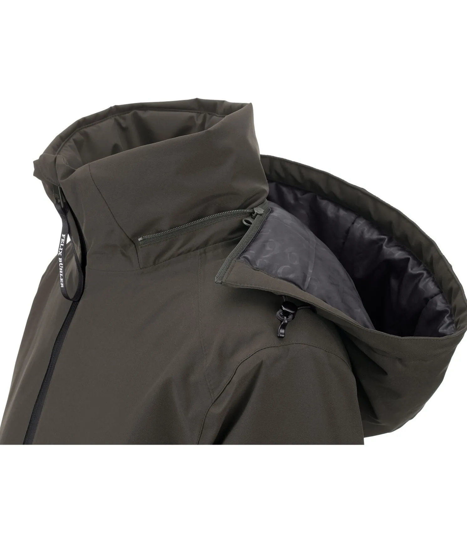 Veste d’équitation avec doublure chaude. Matière respirante, imperméable (10.000 mm) et coupe-vent. Col montant. Capuche amovible et réglable. Bouton-pression pour fixer la capuche dans le dos. Fermeture à glissière double sens étanche avec sous-patte. 2 poches avant zippées et dissimulées. 1 poche intérieure zippée. Bas des manches ajustable, élastiqué et coupe-vent. Bouton-pression sur chaque côté. Coupe plus longue à l’arrière. Imprimé Felix Bühler sur les manches, la capuche et les poignets. 100 % polyester.