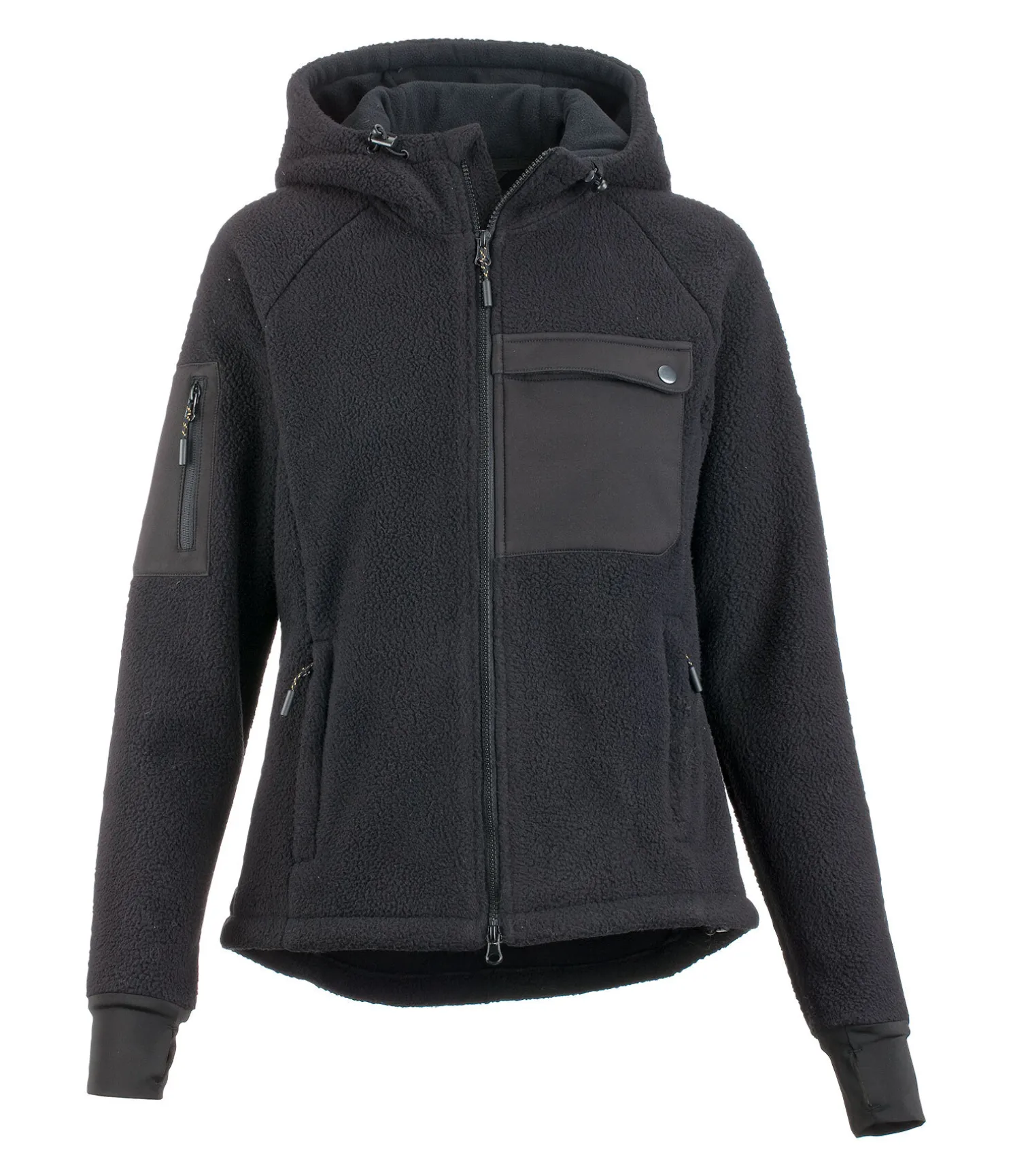 Veste à capuche douillette et technique avec fermeture à glissière double sens à l’avant, poches plaquées en softshell sur la poitrine et le haut du bras et 2 poches latérales zippées. Taille et capuche avec cordon de serrage. Bas de manche élastiqués avec passe-pouce. Broderie dans le dos. 100 % polyester.