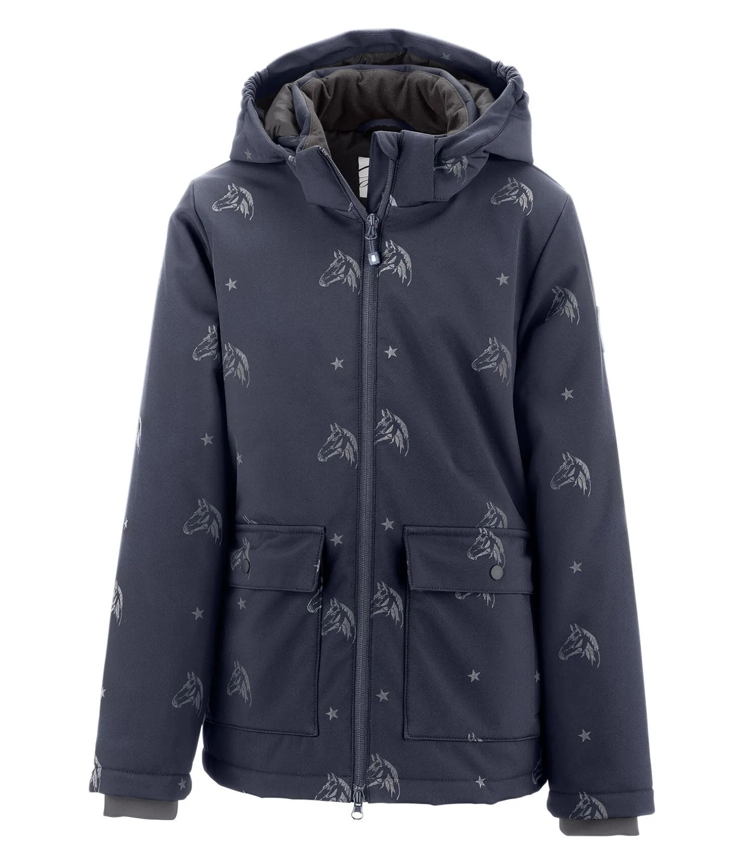 Veste softshell chaude pour enfant avec imprimé all-over réfléchissant motif chevaux, pois et inscription logo. Déperlante, coupe-vent et respirante. Col haut avec capuche pouvant être fixée dans le dos par bouton-pression, fermeture à glissière double sens avec sous-patte et protège-menton, 2 poches à rabat avec bouton-pression et poche latérale devant. Bas des manches avec finition bord-côte coupe-vent et badge STEEDS sur la manche. 94 % polyester, 6 % élasthanne.